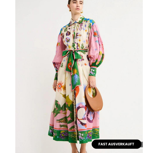 Dam Maxiklänning – Mystiskt Konstmönster – A-linje – Ballongärmar – Skjortkrage – Midjebälte
