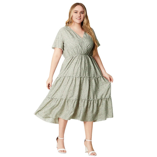 Trixie - Blommig midiklänning i plusstorlek för kvinnor – V-ringad – Korta ärmar – Avslappnad sommarlook