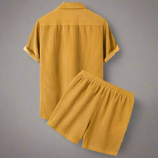 Herrset - Kortärmad Skjorta & Shorts - Ribbad Bomull - Avslappnad Passform - Knäppning & Bröstficka