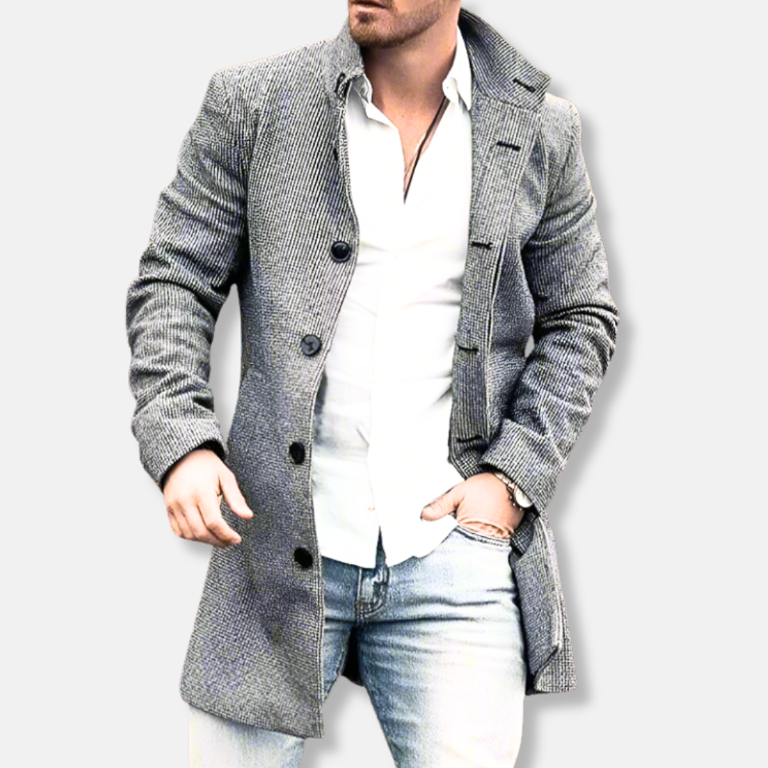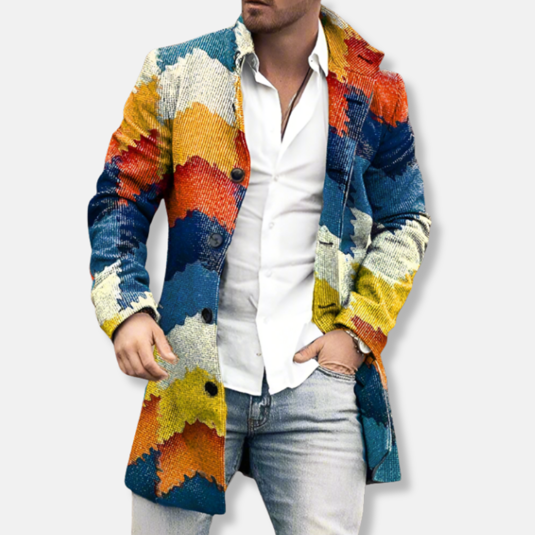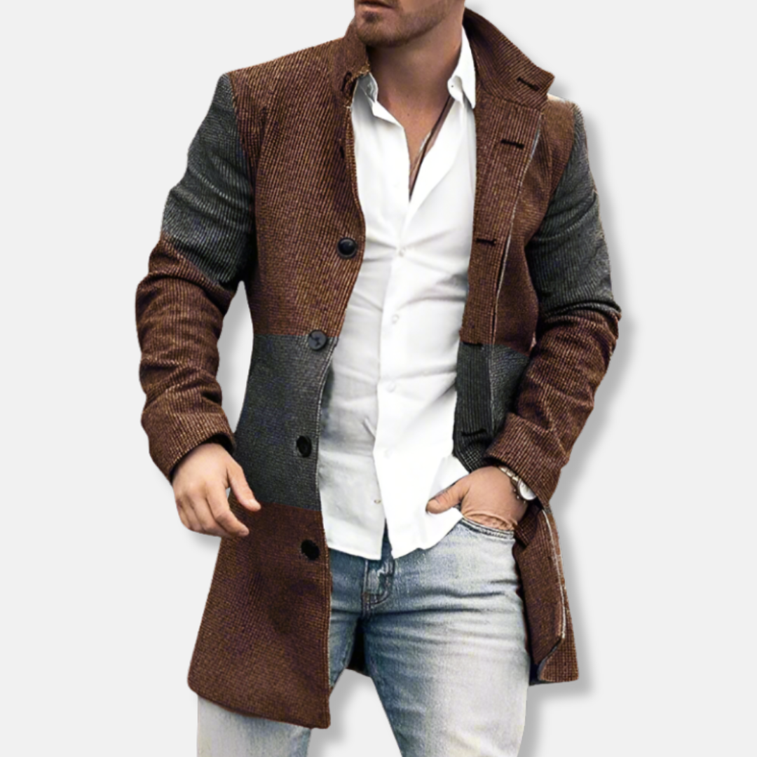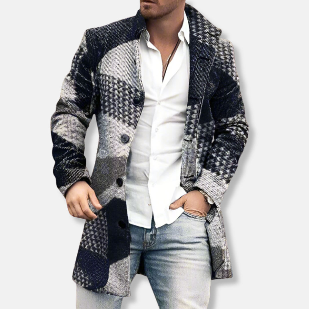 Denna medellånga rock, designad med en normal passform, erbjuder en sofistikerad stil för vardagliga tillfällen. Dess enkelknäppning och färgblockdesign ger en modern touch som kompletterar din garderob. Med långa ärmar och en klassisk krage är den ett mångsidigt plagg för den medvetne mannen. Det mönstrade tyget bidrar till en distinkt look.