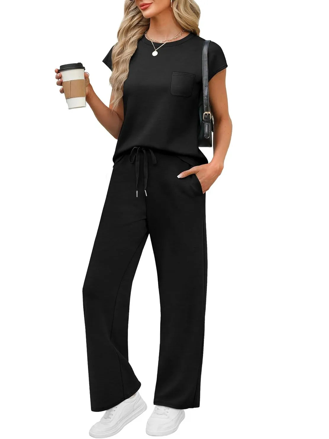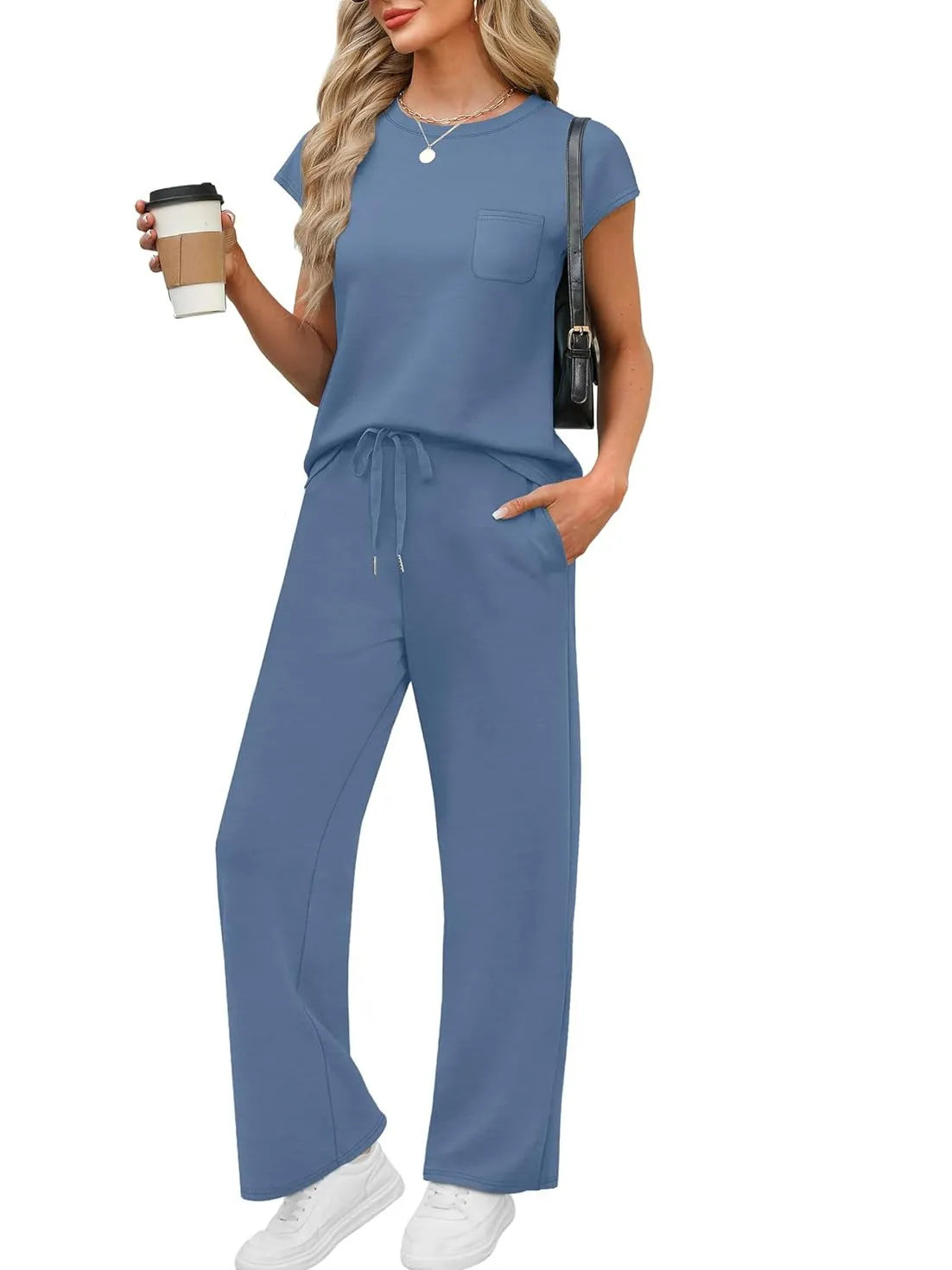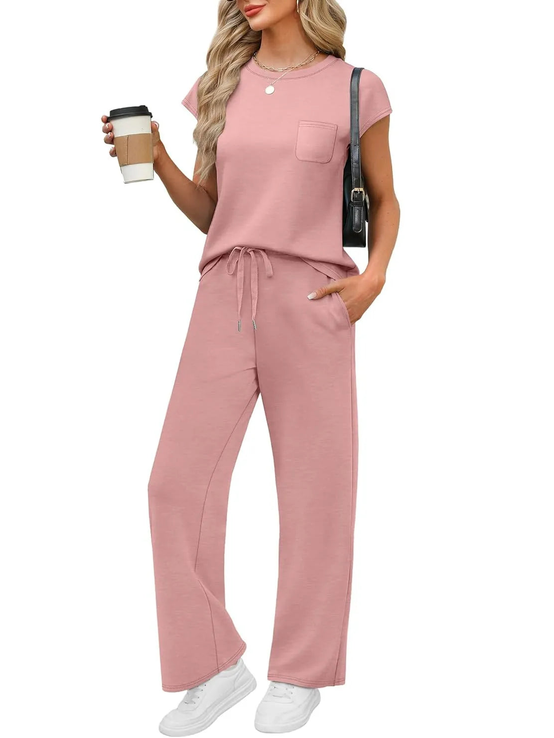 Avslappnat loungeset för kvinnor - Kortärmad topp med ficka - Dragskobyxor