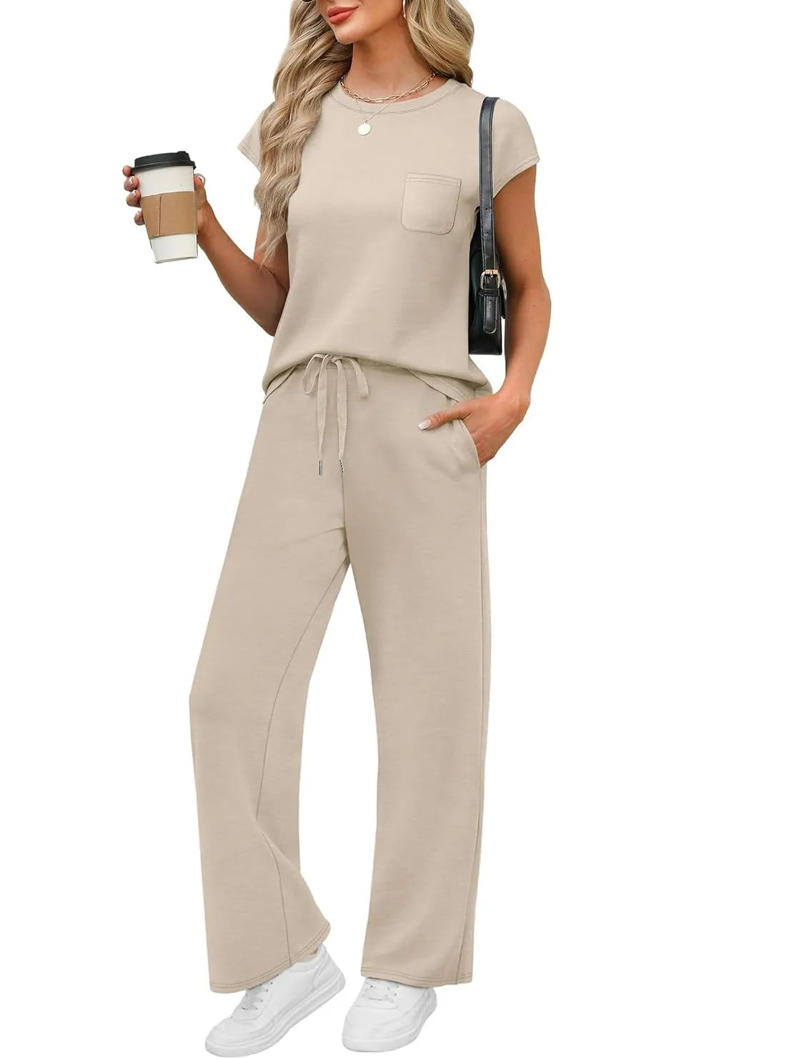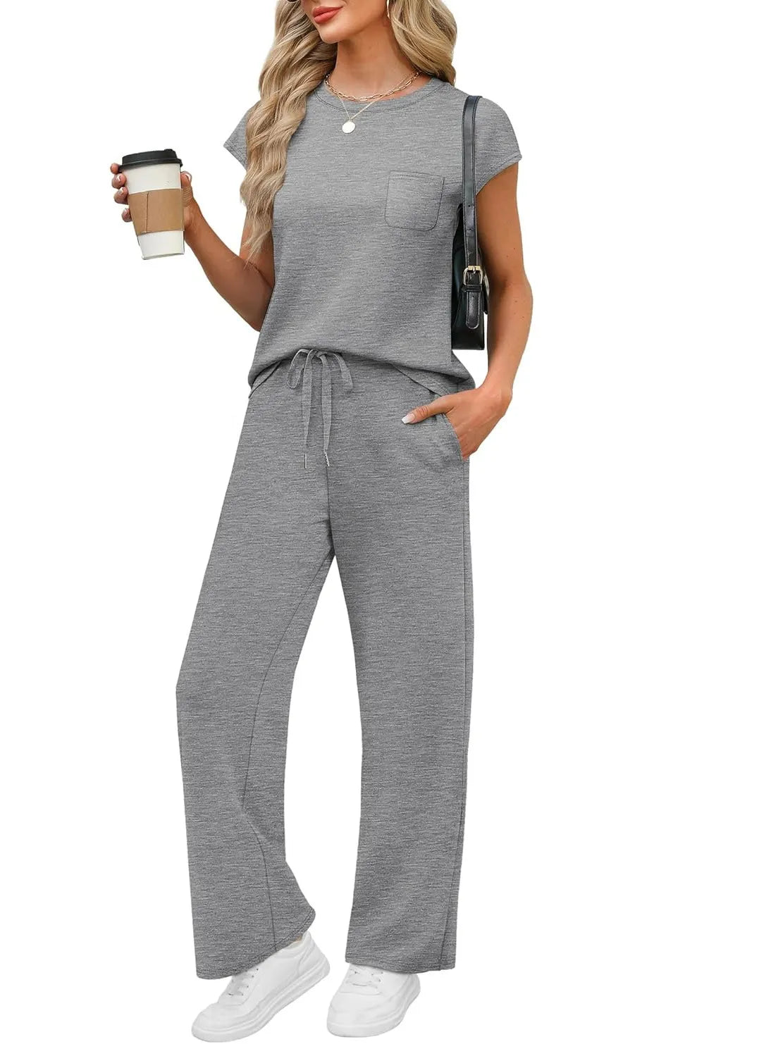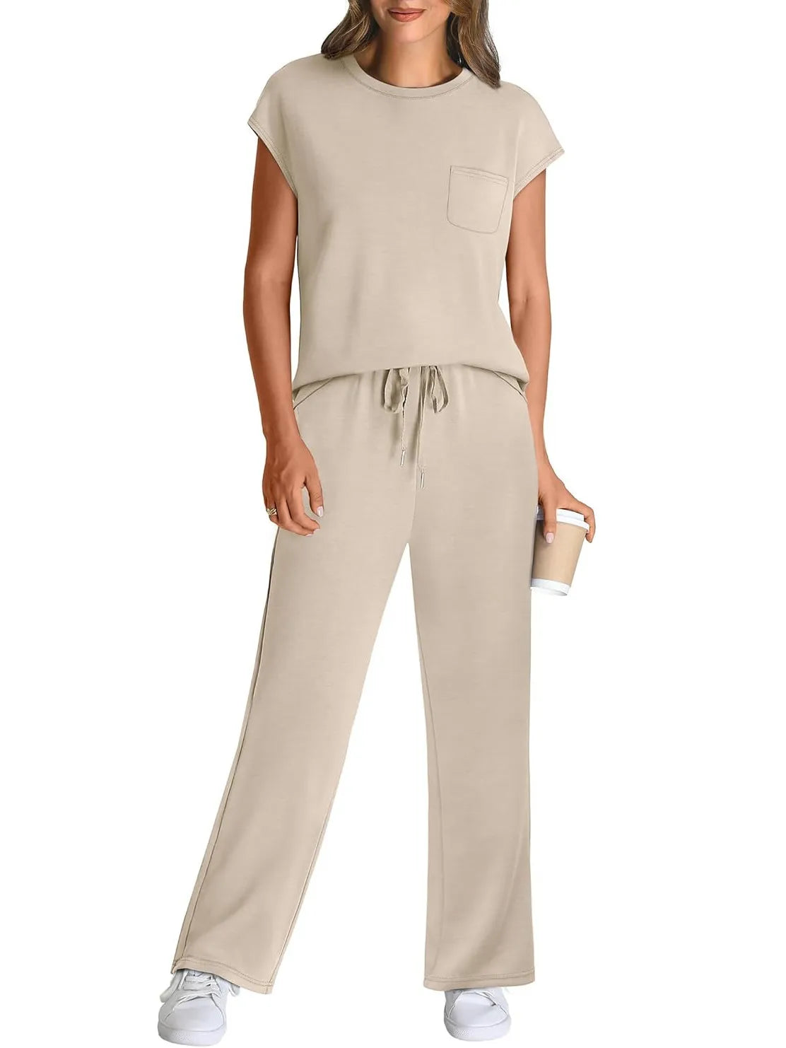 Avslappnat loungeset för kvinnor - Kortärmad topp med ficka - Dragskobyxor
