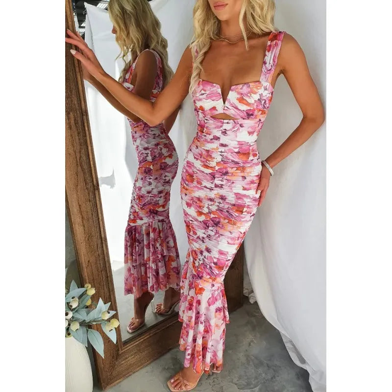 Blommig sjöjungfruklänning med åtsittande detaljer för kvinnor - Rynkad detalj - Hjärtformad halsringning
