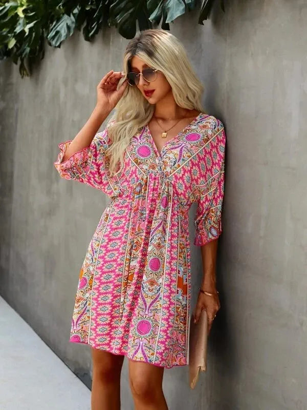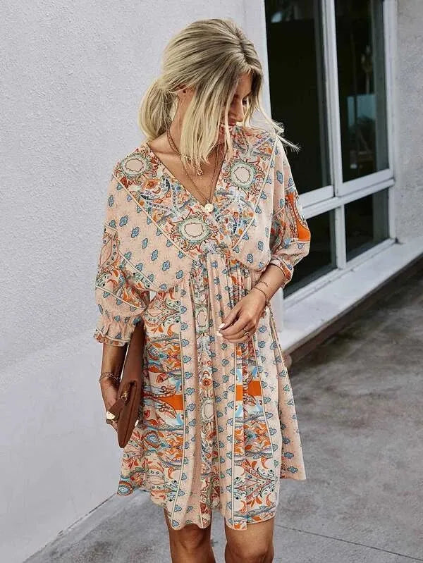 Bohemisk klänning för kvinnor - Blommönster - Avslappnad passform