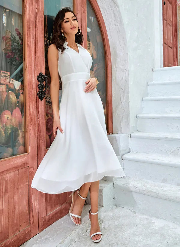 Denna ärmlösa midiklänning kombinerar tidlös elegans med en smickrande A-linjeformad silhuett. Den djupa V-ringningen och den böljande fållen skapar en graciös look som är perfekt för både dagtidsfester och kvällsfester. Dess eleganta enkelhet gör den till ett enkelt val för en mängd olika speciella tillfällen.
