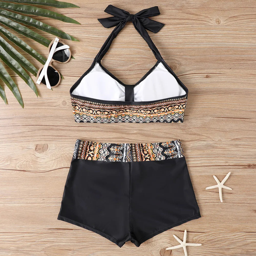- Design: Geometriskt mönster, hög midja, justerbara band, full support