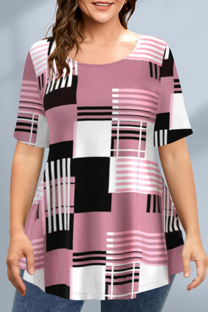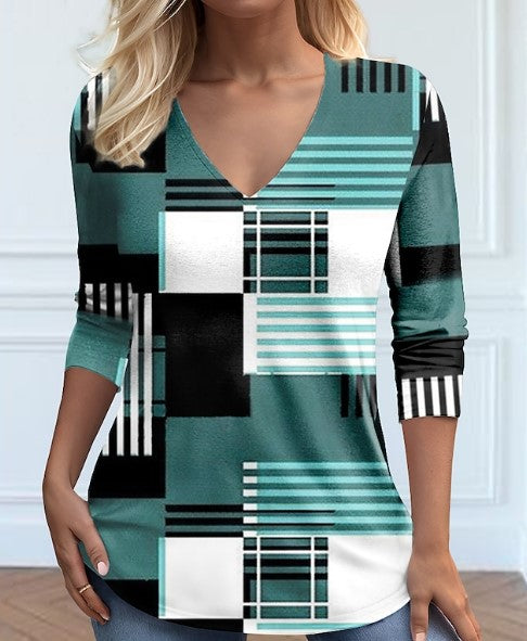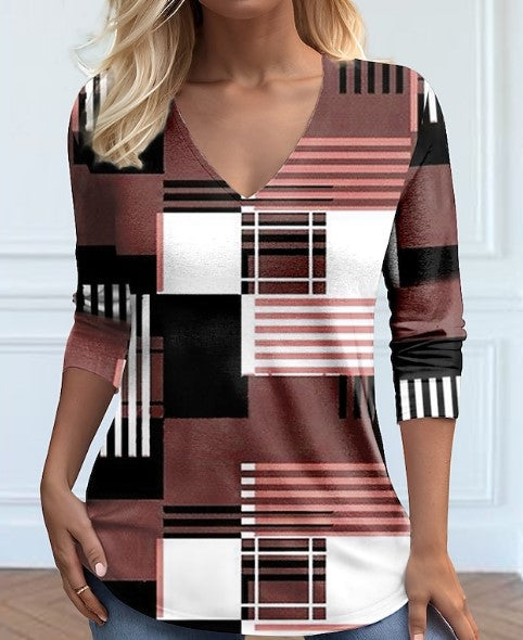 Dam Blus - V-ringad - Trekvartsärm - Geometriskt Mönster - Bekväm och Stilren