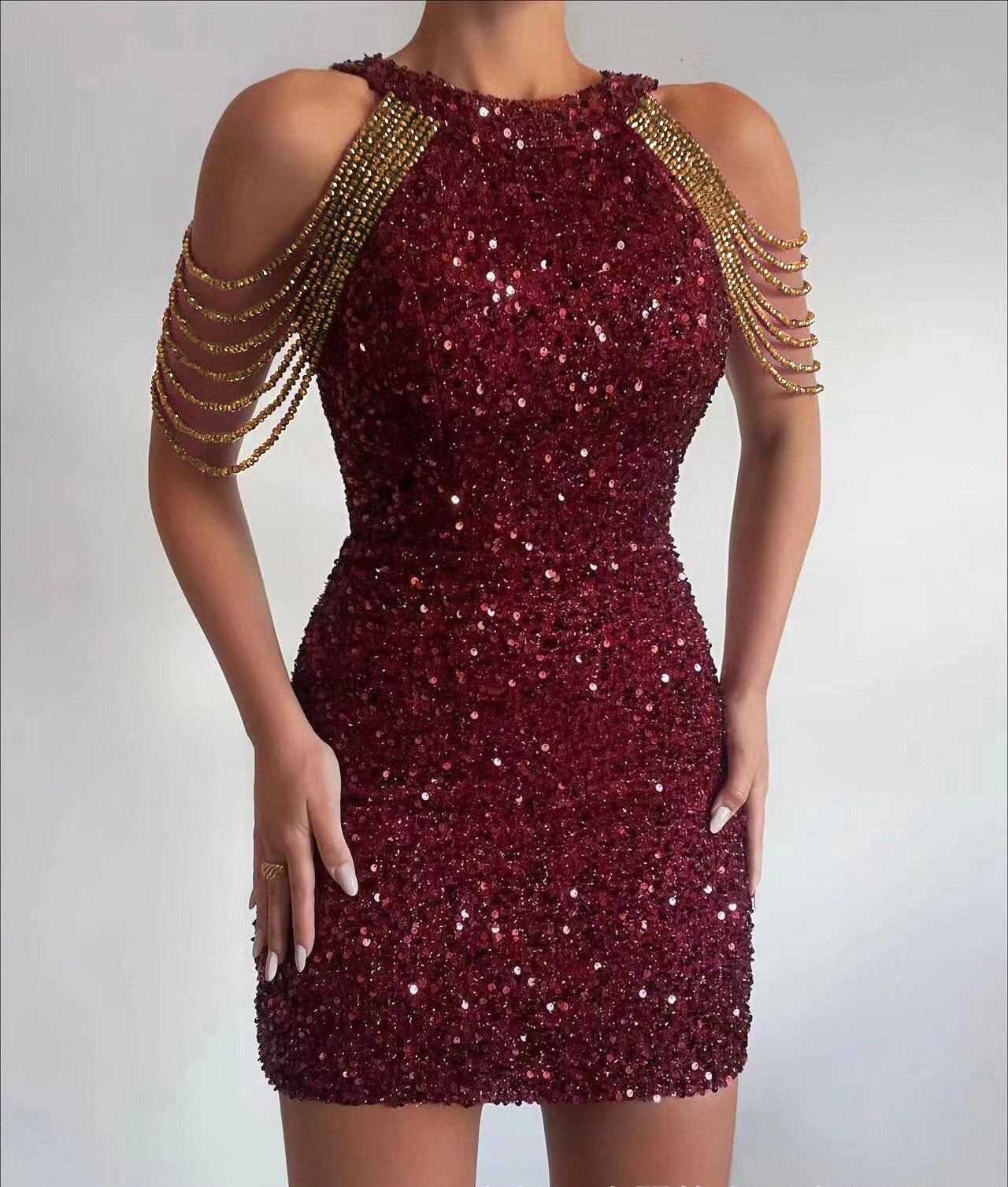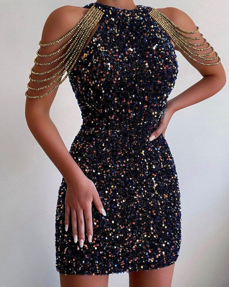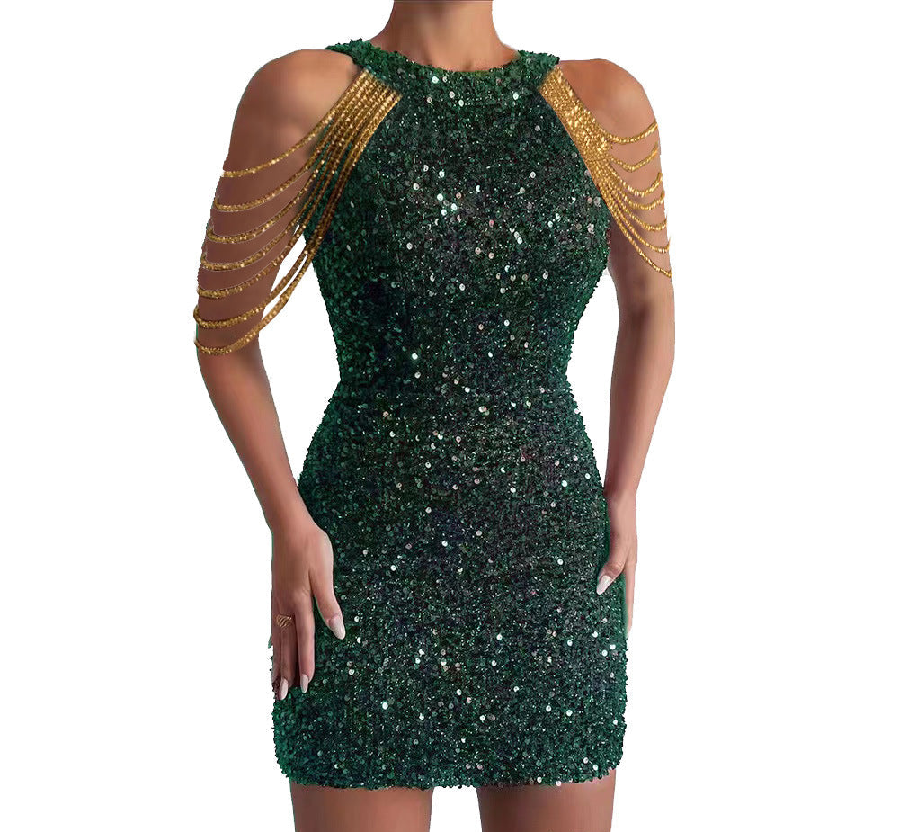 Dam Cocktailklänning – Figurnära Passform – Paljettdekor – Kall Axel – Elegant Detalj