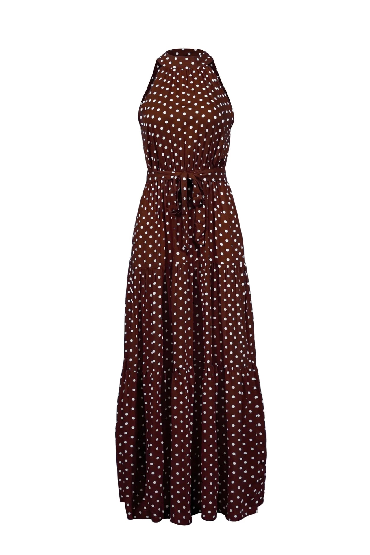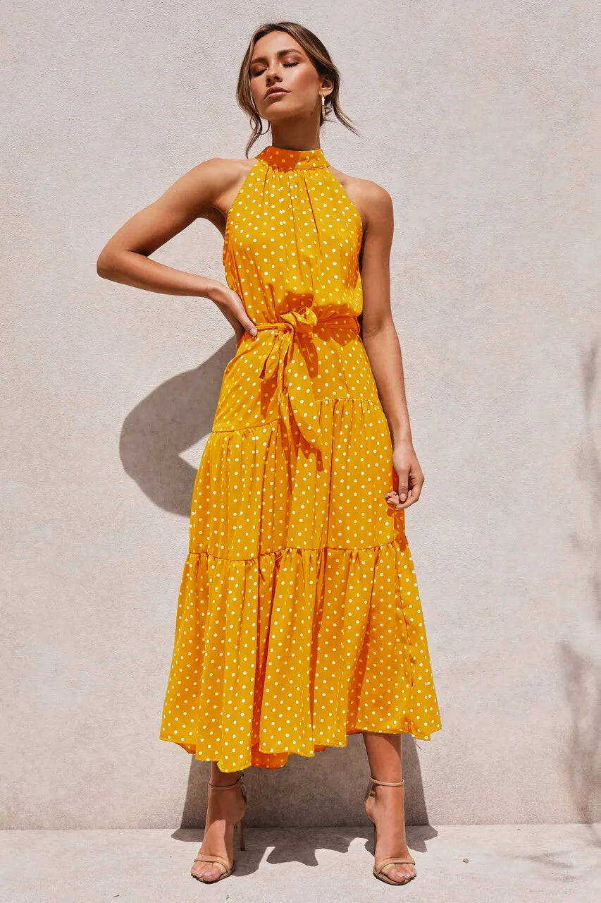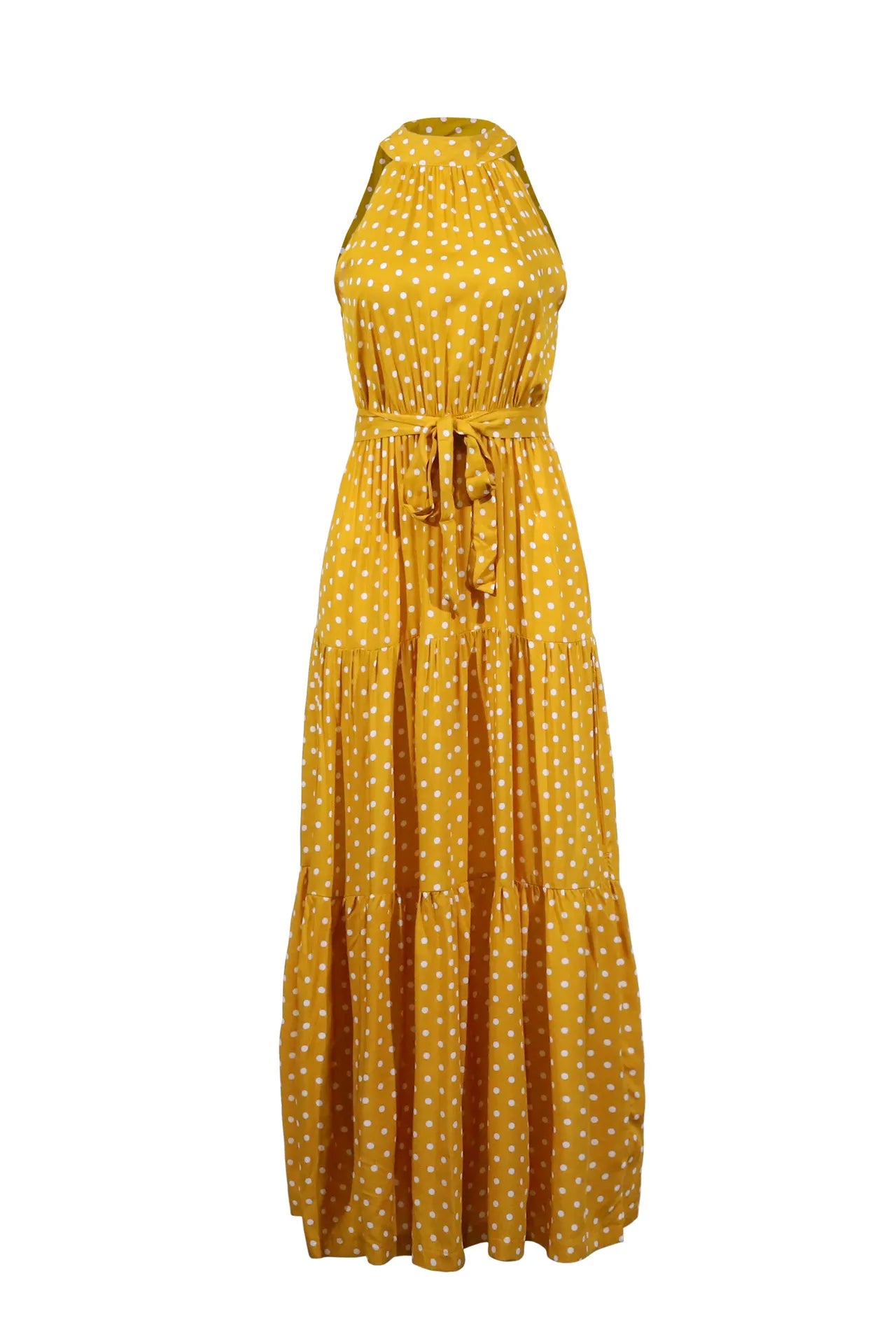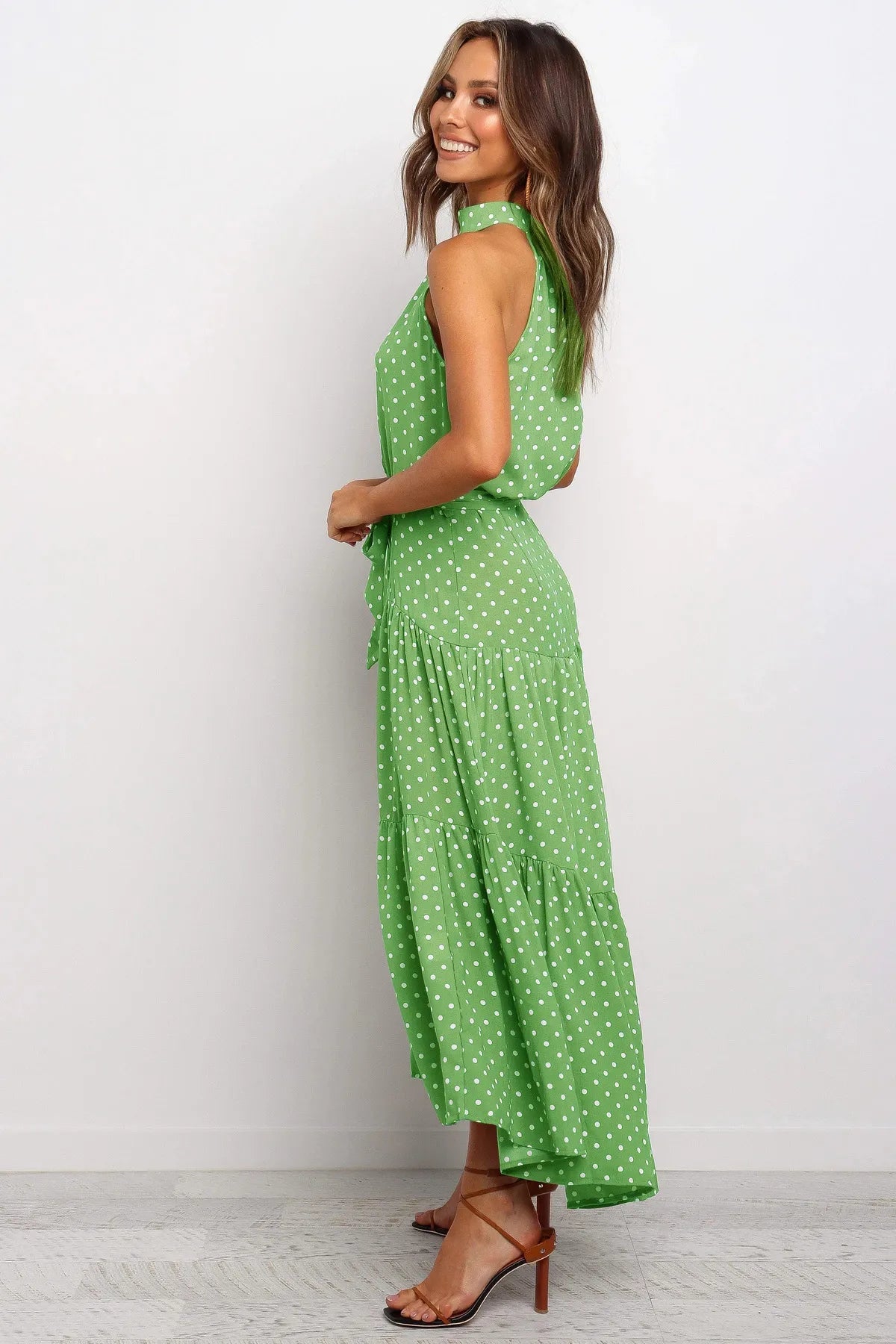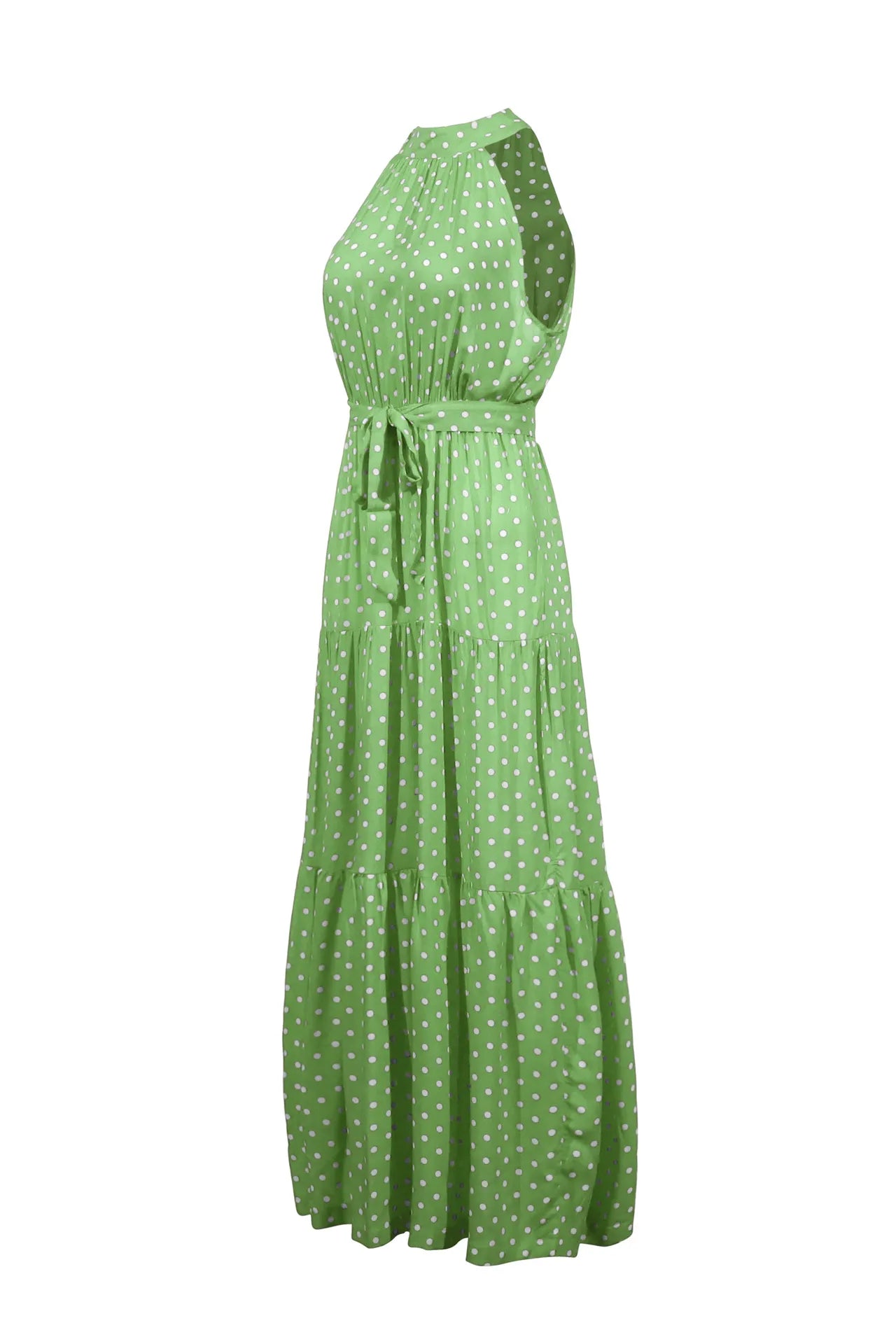 Kliv in i en värld av tidlös stil med vår gröna halterneckklänning för kvinnor med ett härligt prickigt mönster. Den skiktade kjolen böljar graciöst och skapar en elegant look som är både lekfull och sofistikerad. Perfekt kompletterad av en knuten midja, erbjuder detta eleganta plagg både komfort och klass för alla tillfällen.