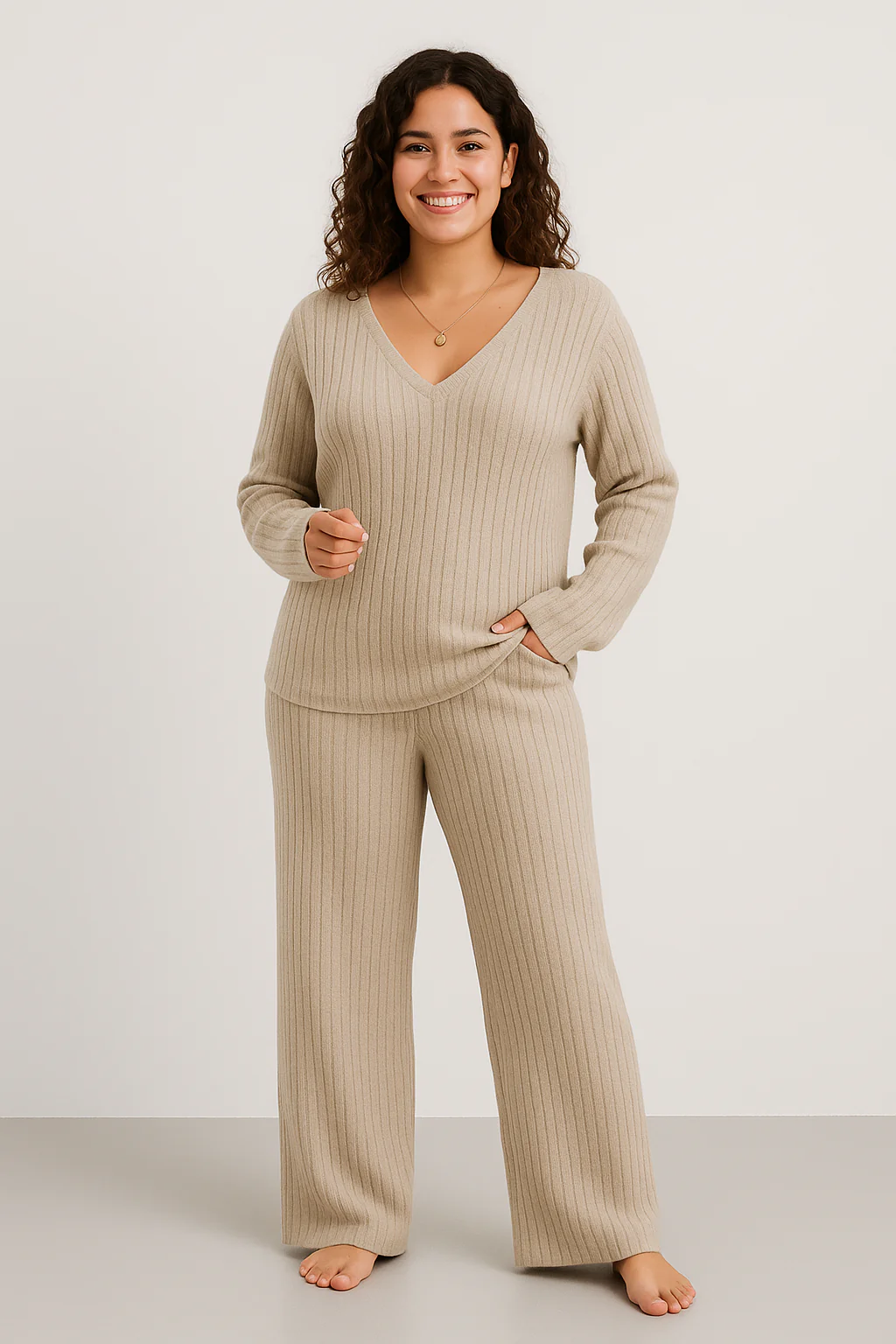 Dam Lounge Set – Ribbstickad – Avslappnad Passform – V-ringad Topp – Vida Byxor