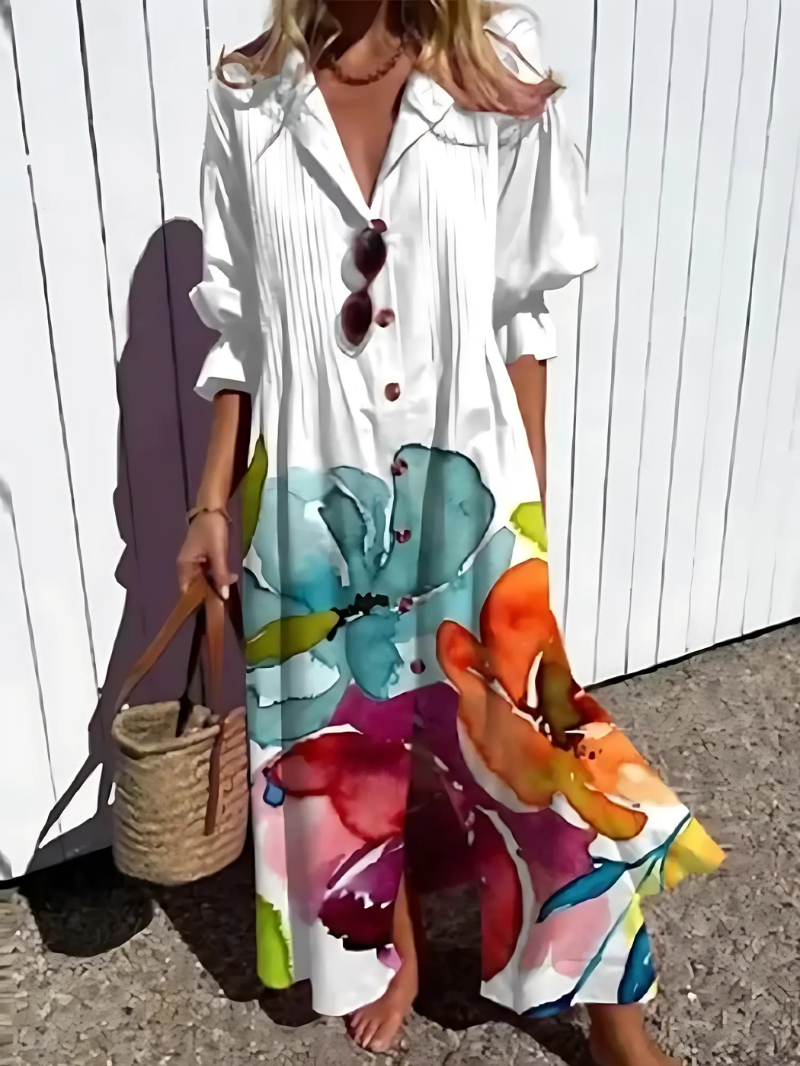 Dam Maxi Klänning – Avslappnad Passform – Naturfibrer – Knäppning – Bladtryck