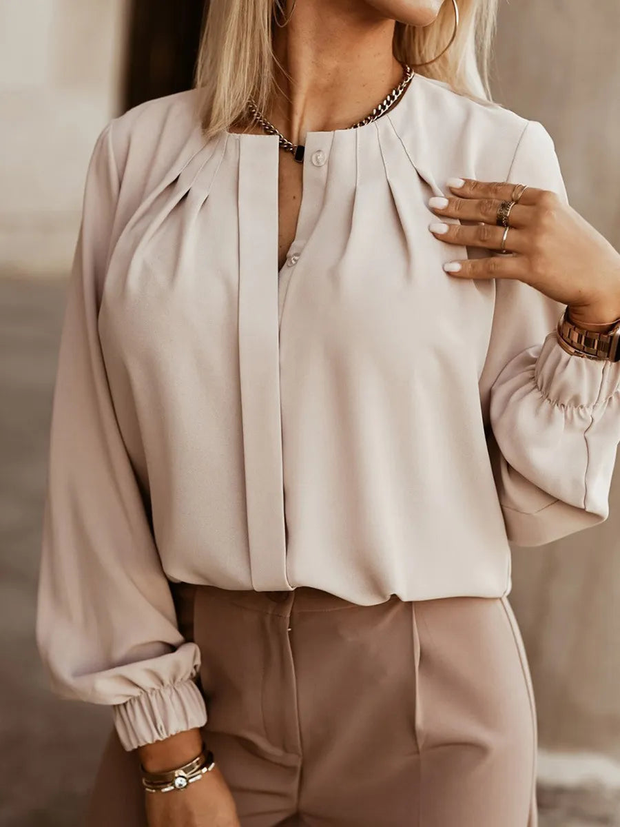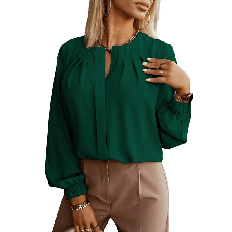 Plisserad långärmad blus för kvinnor – Knappar framtill – Elegant Kontorstopp