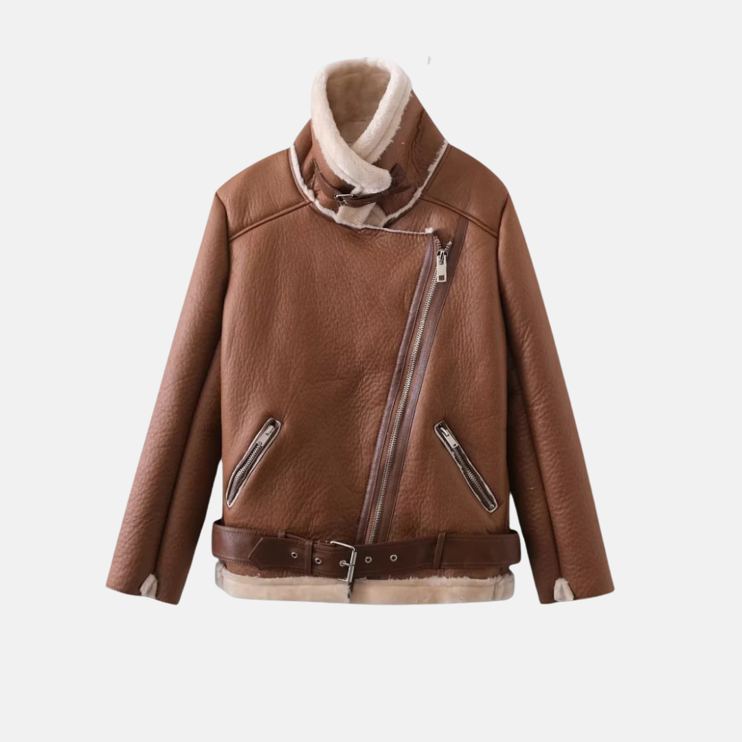 Eva-Janssons Jacka Motorcykelmodell med Fuskpäls och Midjebälte är en damjacka med lös passform, fuskpälsfoder, asymmetrisk dragkedja och midjebälte. Perfekt för en trendig, avslappnad look. En idealisk motorcykelmodell jacka för den stilmedvetna.