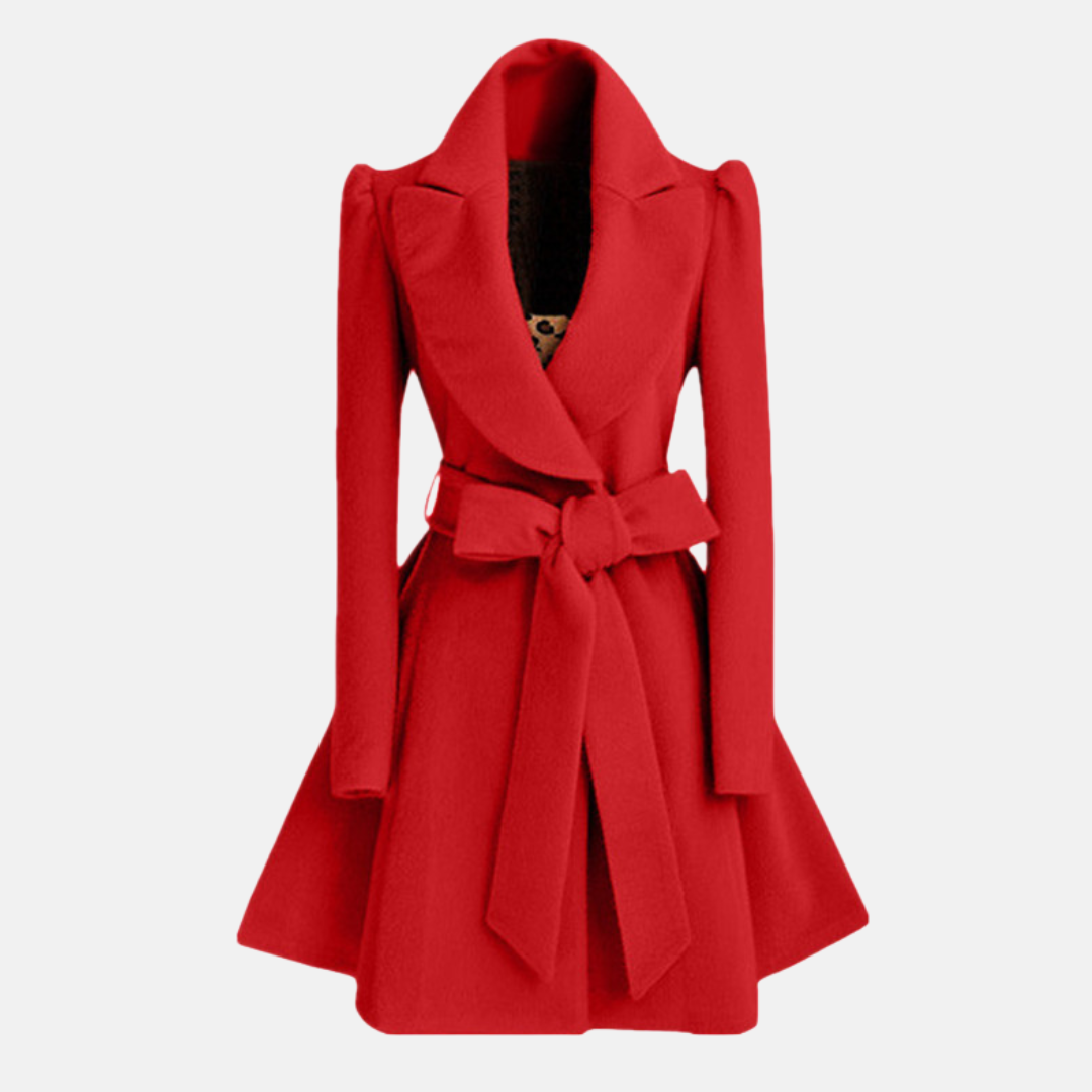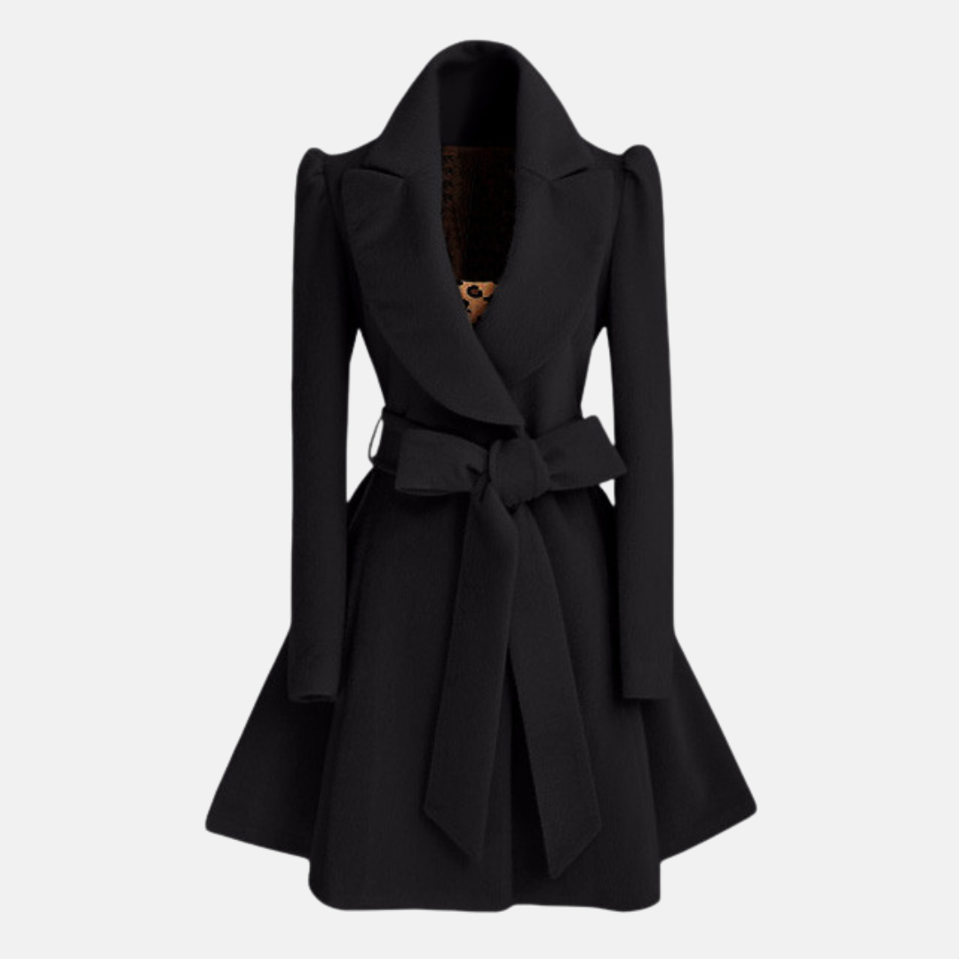 Kappa med Ullkänsla och Midjebälte – elegant slim fit damkappa i A-linjemodell med vid krage och midjebälte med rosett för en stilren look. Perfekt för den modefokuserade kvinnan som söker komfort och elegans.