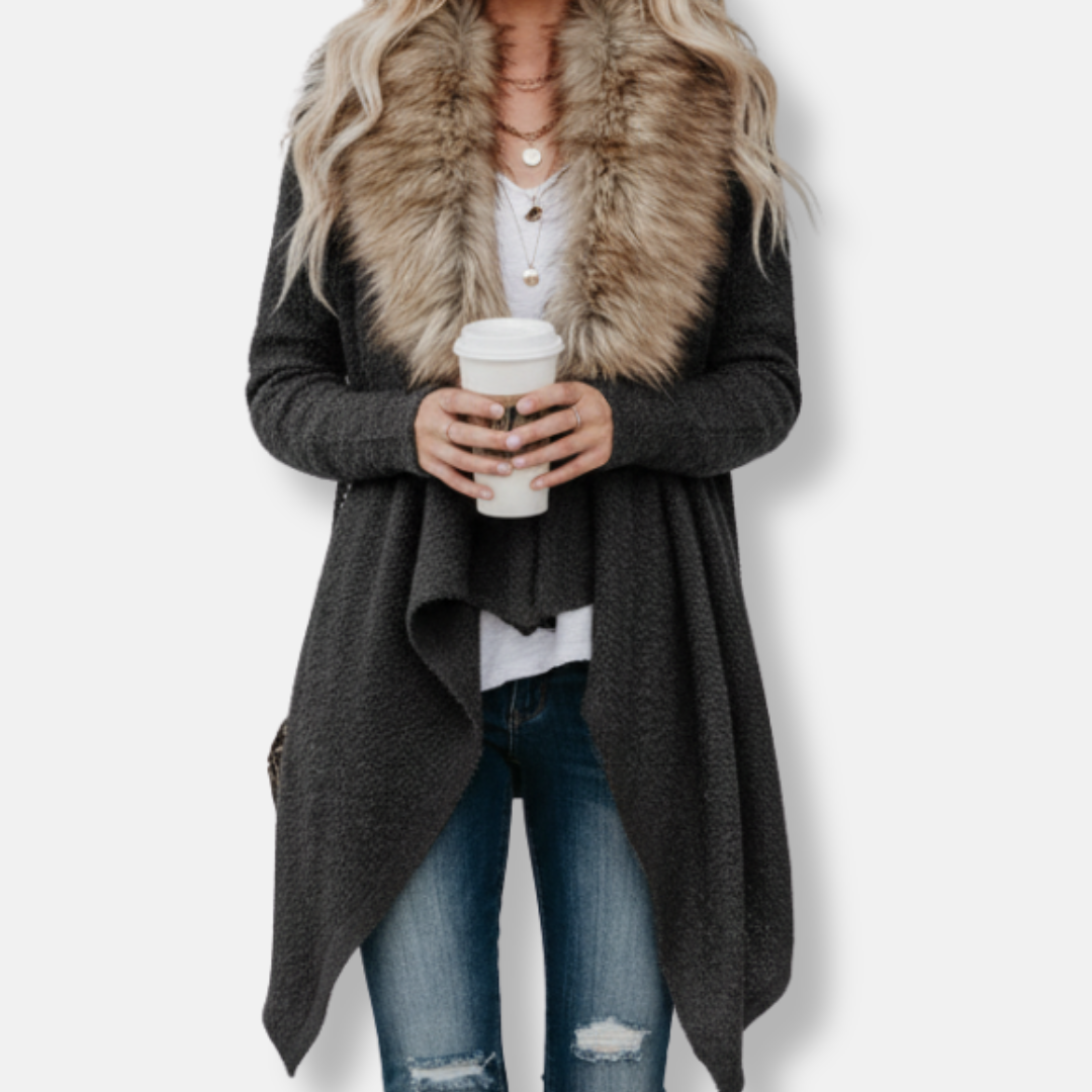 Kofta med Fuskpälskrage i Lös Passform av Eva-Jansson. Denna stickade damkavaj med öppen, draperad kant och mjuk fuskpälskrage ger dig en chic och bekväm stil. Perfekt för lager-på-lager och vardagslyx.