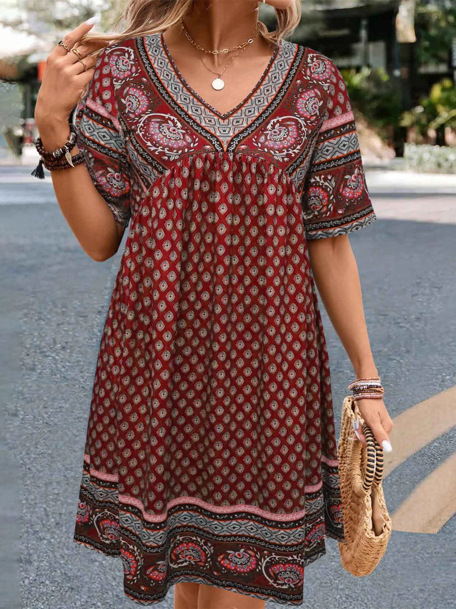 Damklänning – Avslappnad Passform – Knälång – V-ringning – Etnoinspirerat Mönster – Bomullskänsla