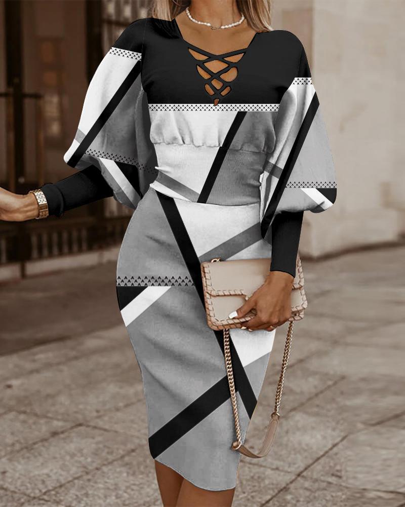 Damklänning bodycon – V-ringning med snörning – Ballongärm – Rutmönster – Knälång