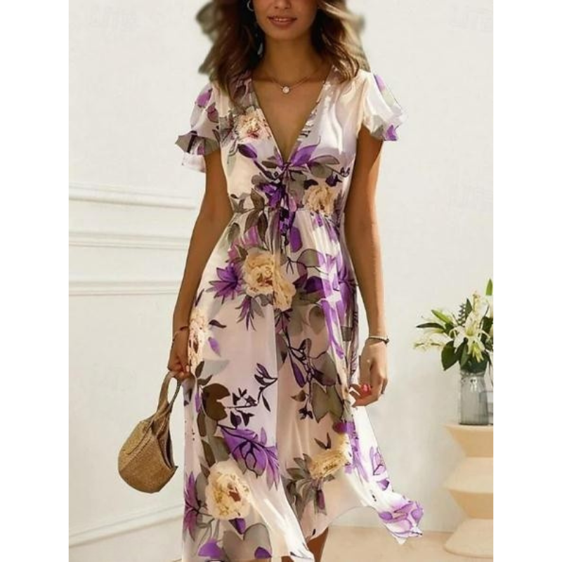 Damklänning – Chiffong – V-ringning – Ryschärm – Blommigt Mönster – Midilängd