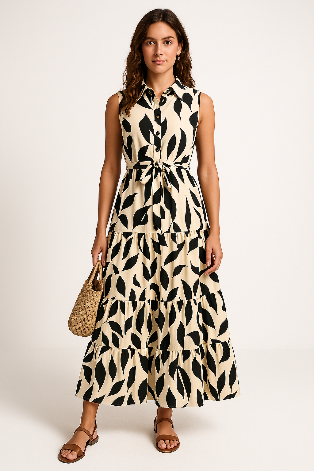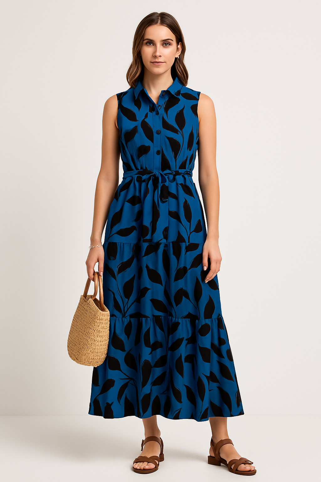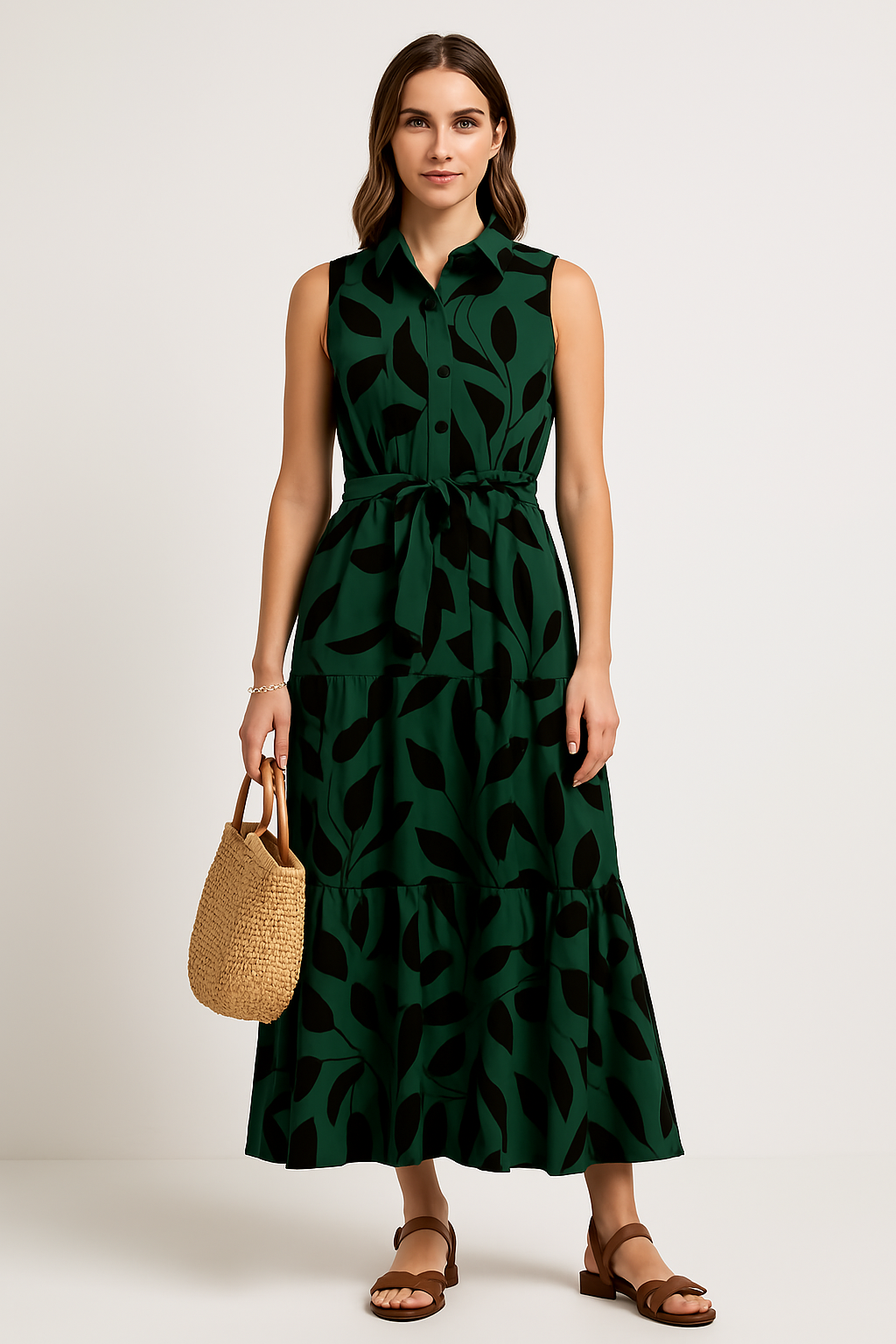 Damklänning – Lång modell – Ärmös med krage – Volangkant – Bladmönster