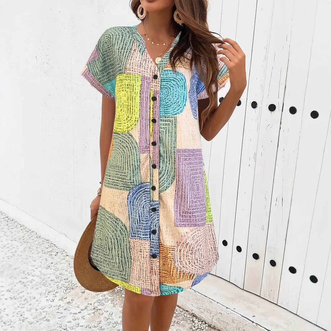Damklänning – Lös Passform – V-ringning – Kort Ärm – Knäppning – Geometriskt Mönster