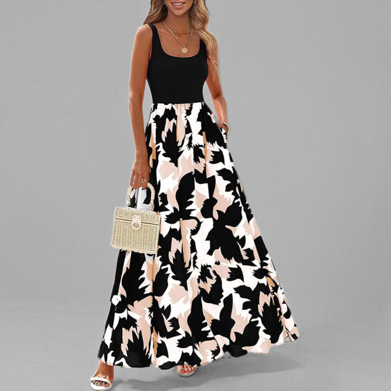 Damklänning maxi – Ärmös scoopneck – Hög midja – A-linjeformad – Tryckt mönster