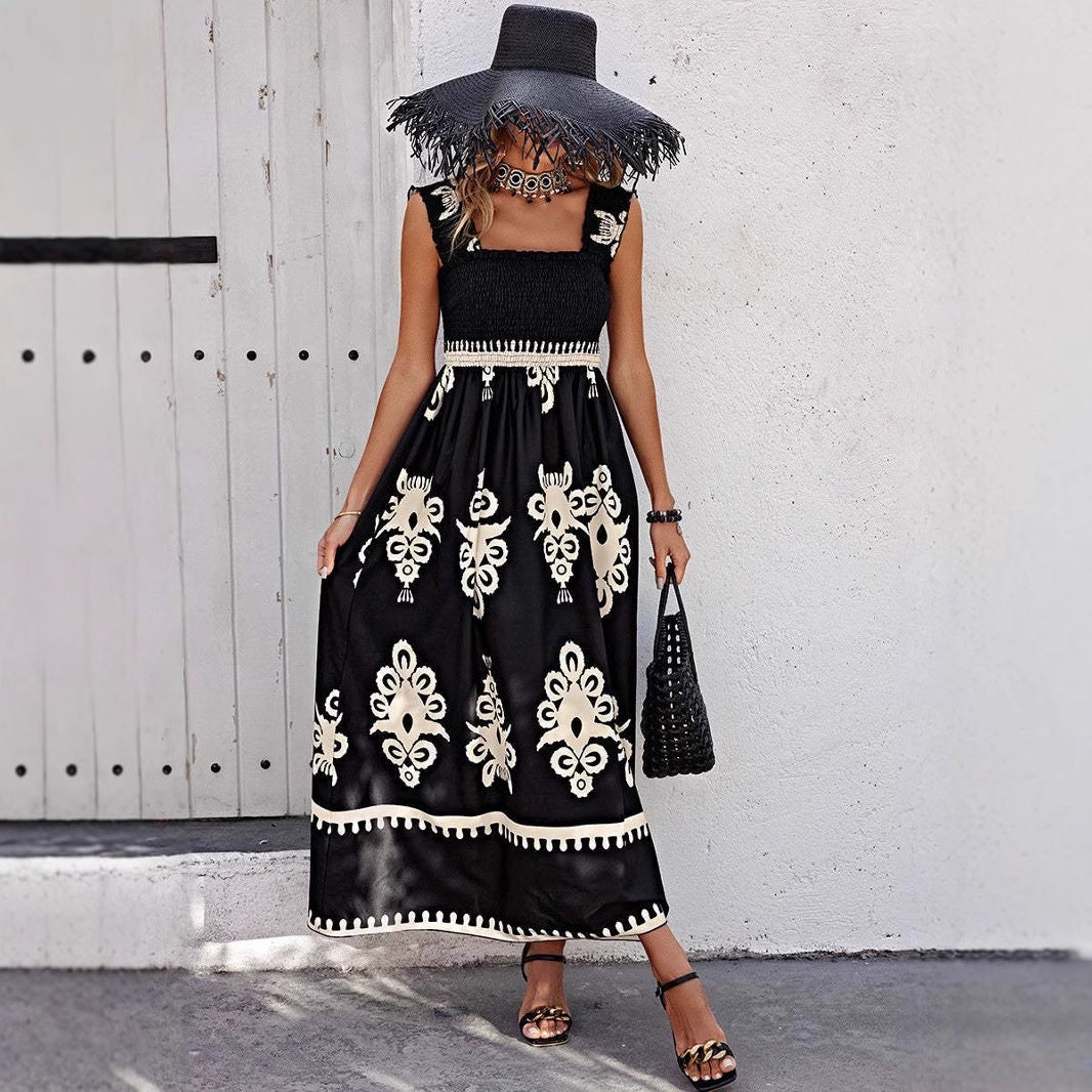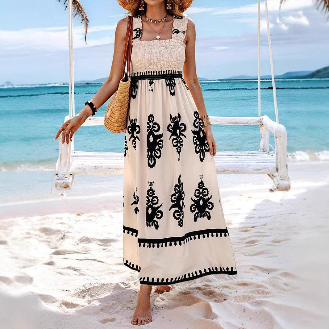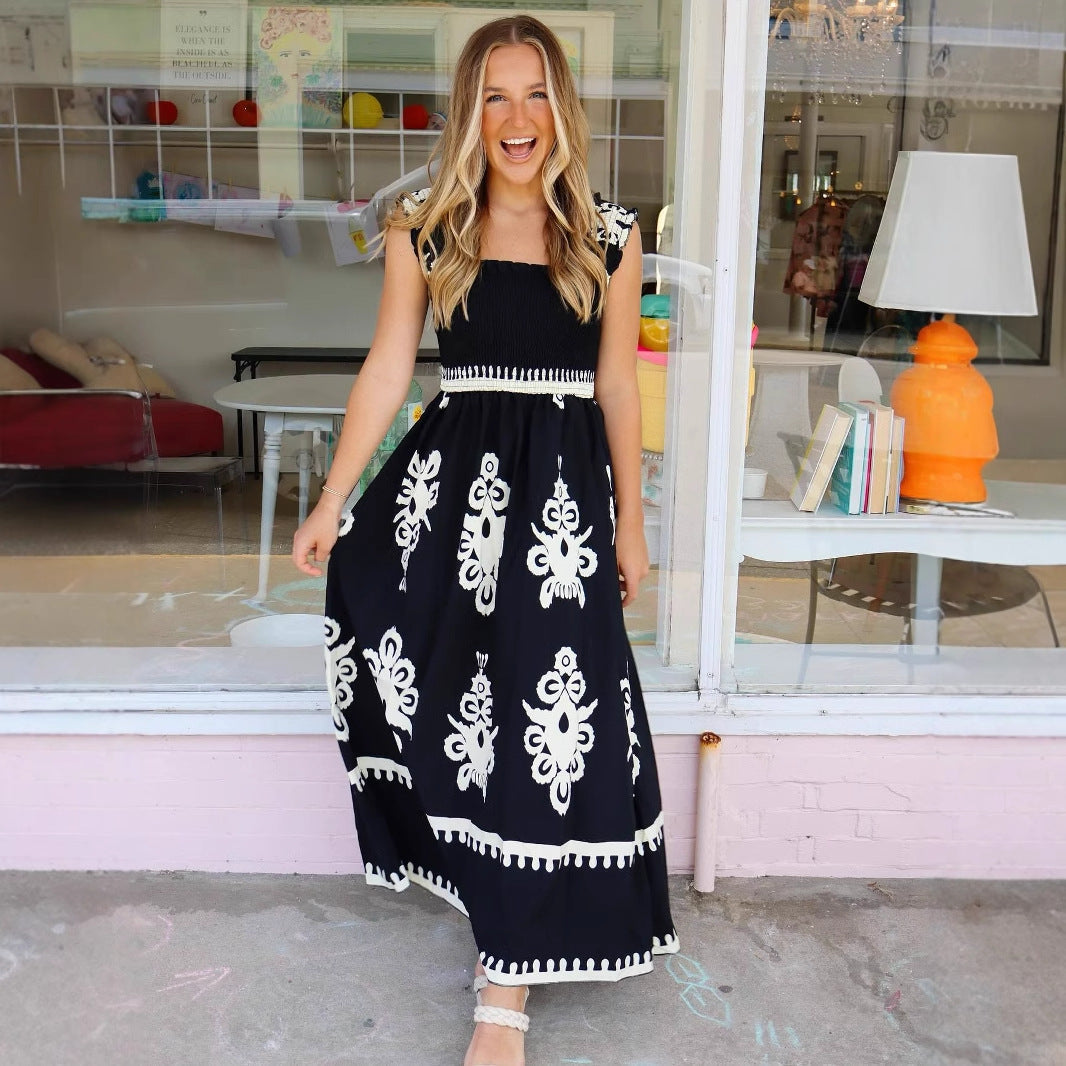 Bohemisk långklänning - Smockklänning i lättviktsbomull med volangband. Denna flödande maxiklänning har ett vackert bohemiskt tryck på lätt, andningsbar bomull. Den smockade överdelen och de volangförsedda axelbanden ger en bekväm och snygg passform, perfekt för sommardagar.