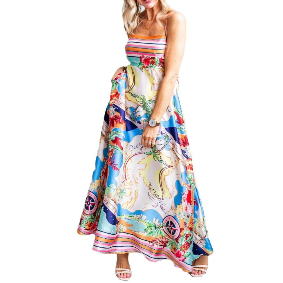 Damklänning maxi – Lätt bomull – Flowy passform – Hög midja – Spagettiaxelband – Mönstrad