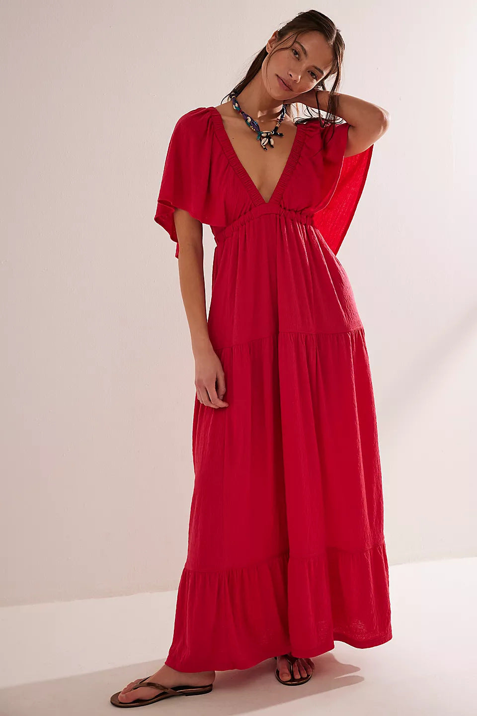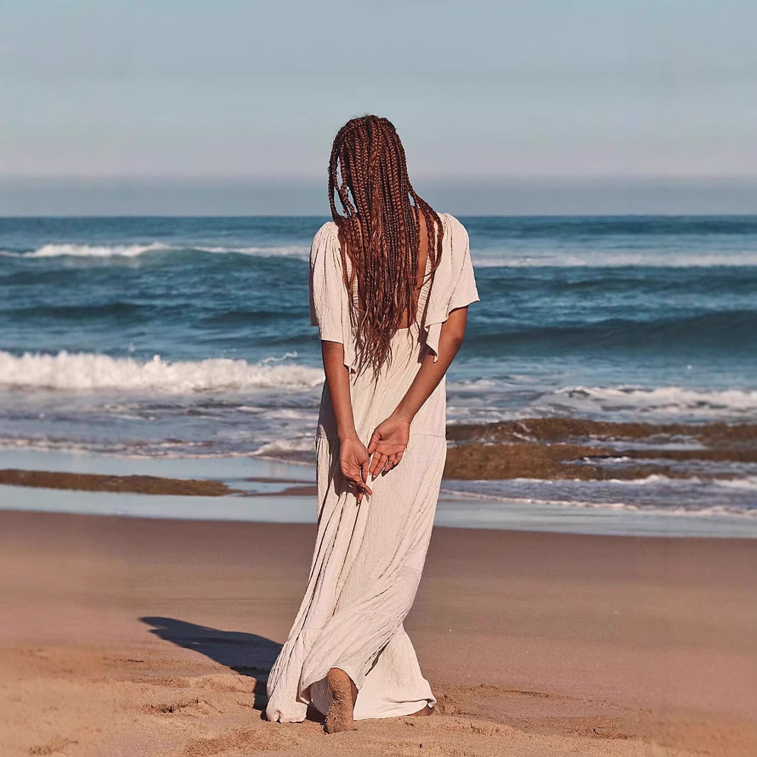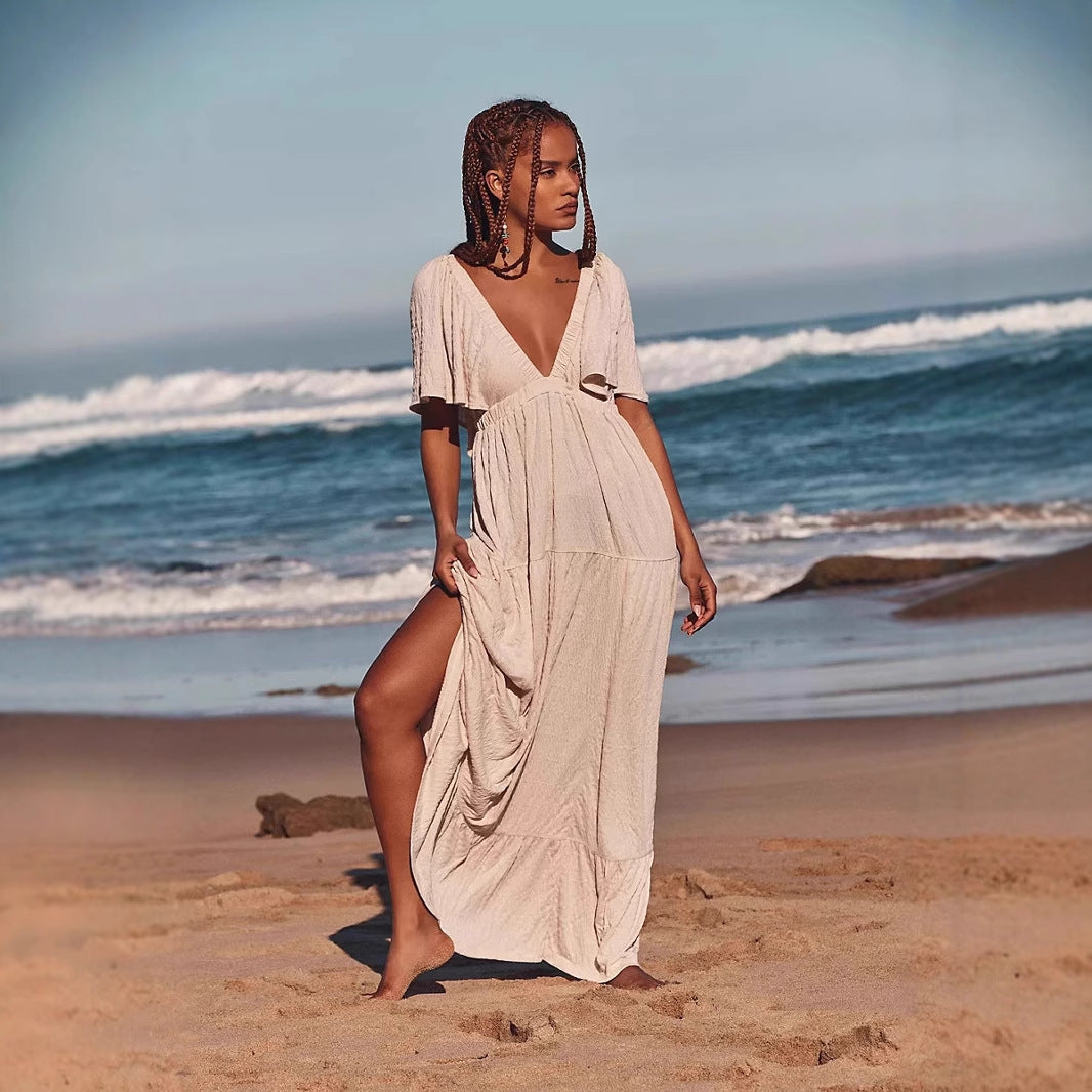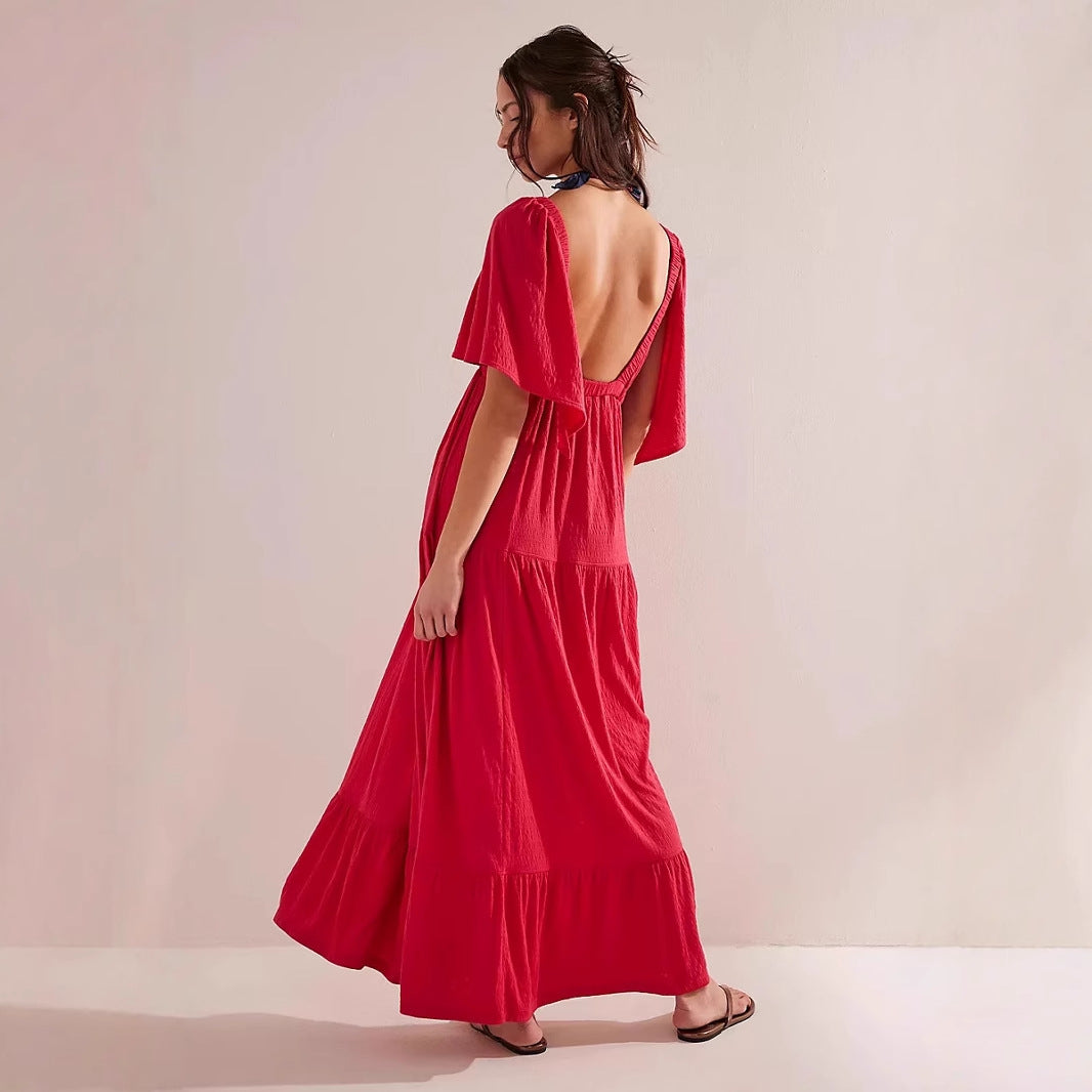 Damklänning maxi – Lös passform – Djup V-ringning – Öppen rygg – Hög slits – Lätt tyg