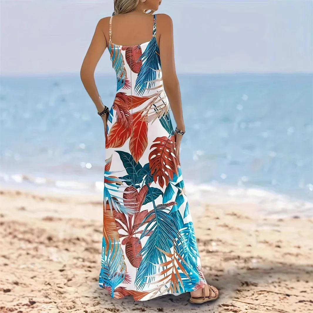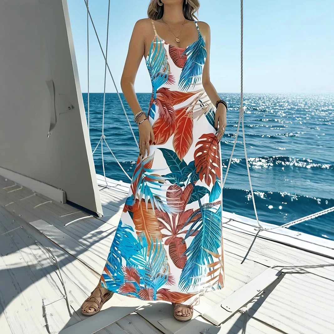 Damklänning maxi – Luftig passform – Spagettiband – Tropiskt bladmönster – Ärmlös