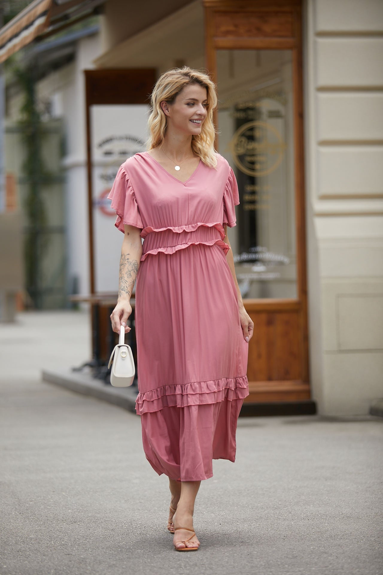 Damklänning Maxi – V-ringning – Volangdetaljer – Luftiga Ärm – Avslappnad Passform