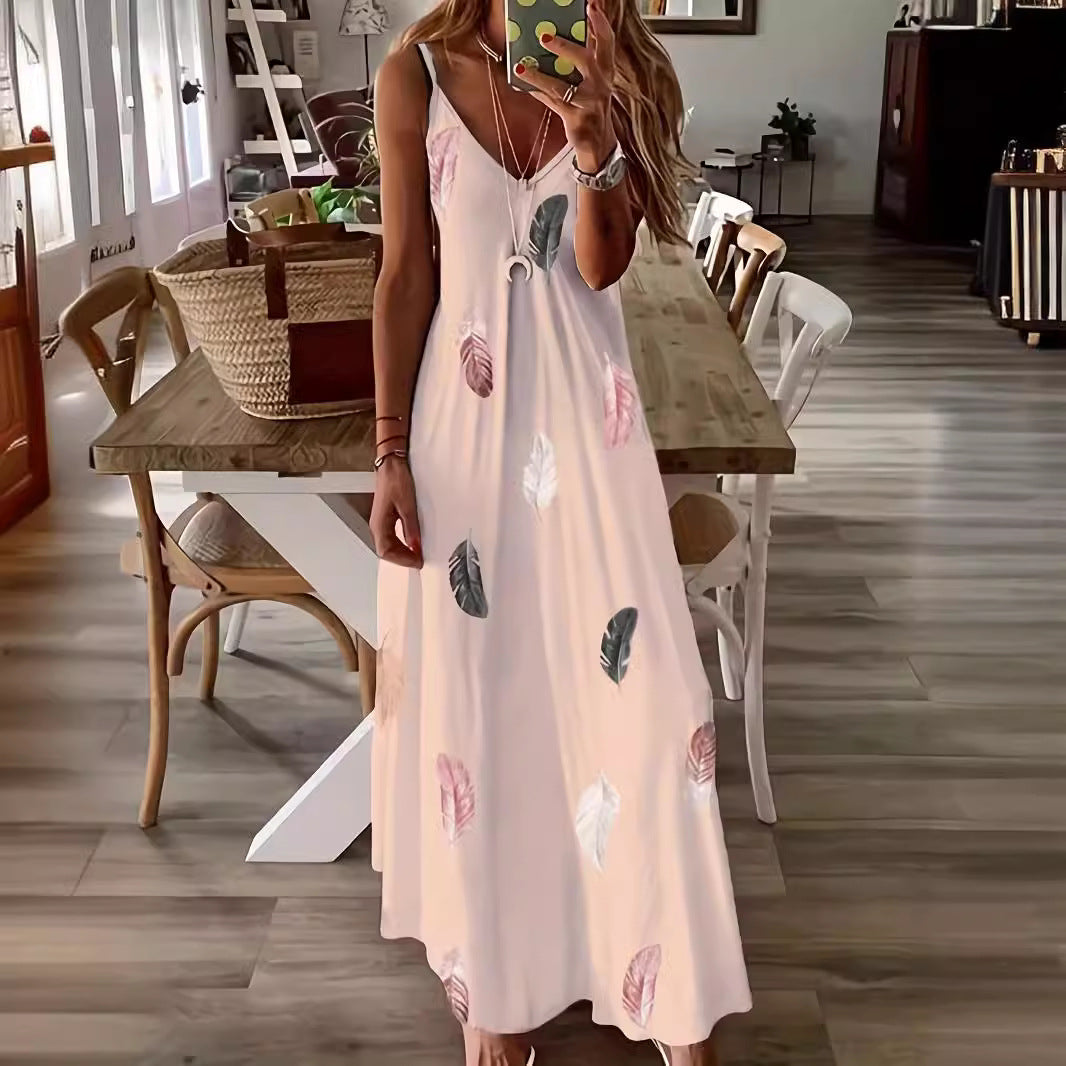 Damklänning – Maxilängd – Ärmlös V-ringning – Lös Passform – Naturmönster