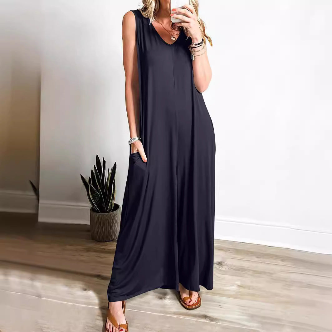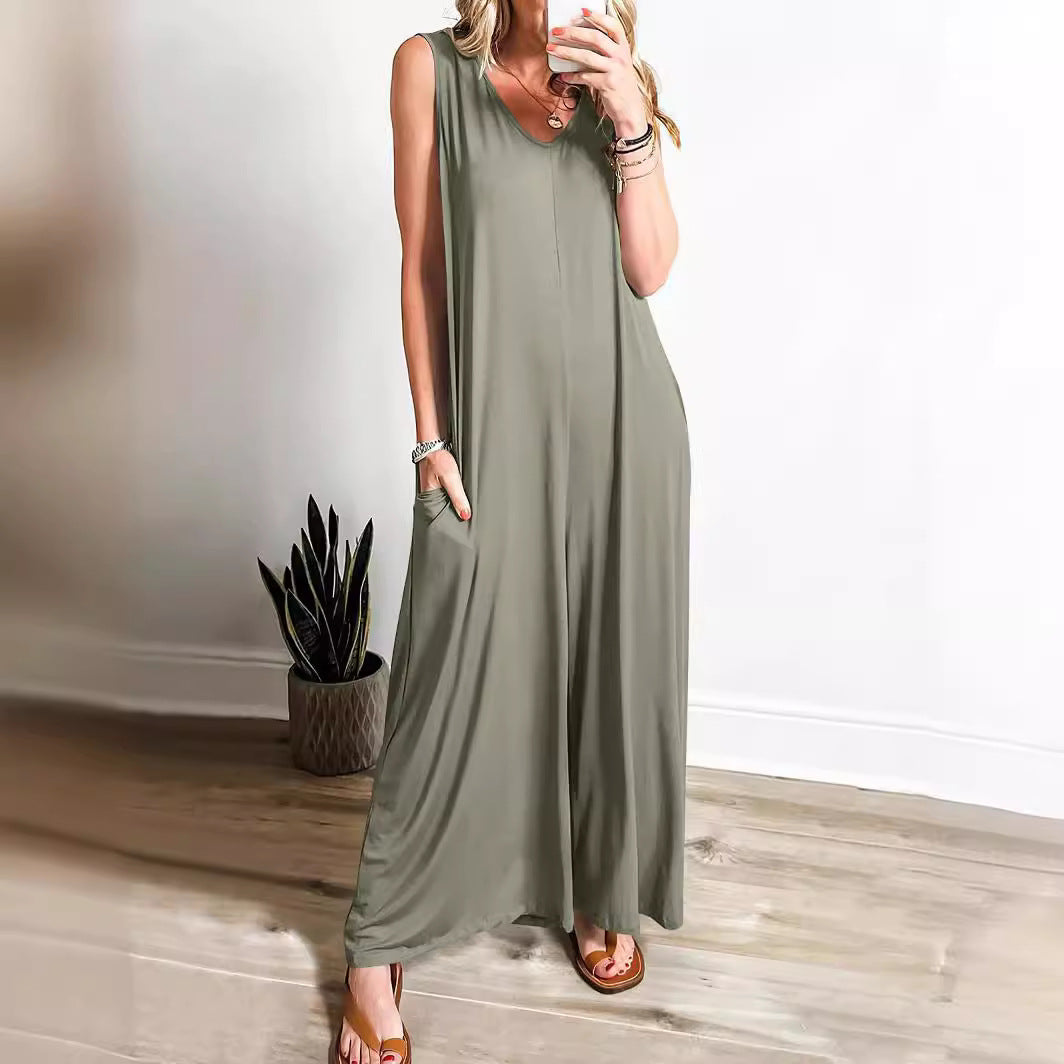 Damklänning – Maxilängd – Ärmös med V-ringning – Mjuk Stickad – Ledig Passform med Fickor