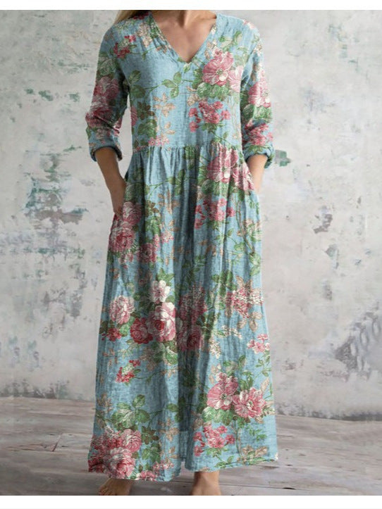 Damklänning – Maxilängd – Naturliga Fibrer – Avslappnad Passform – V-ringning – Lång ärm – Randigt Mönster