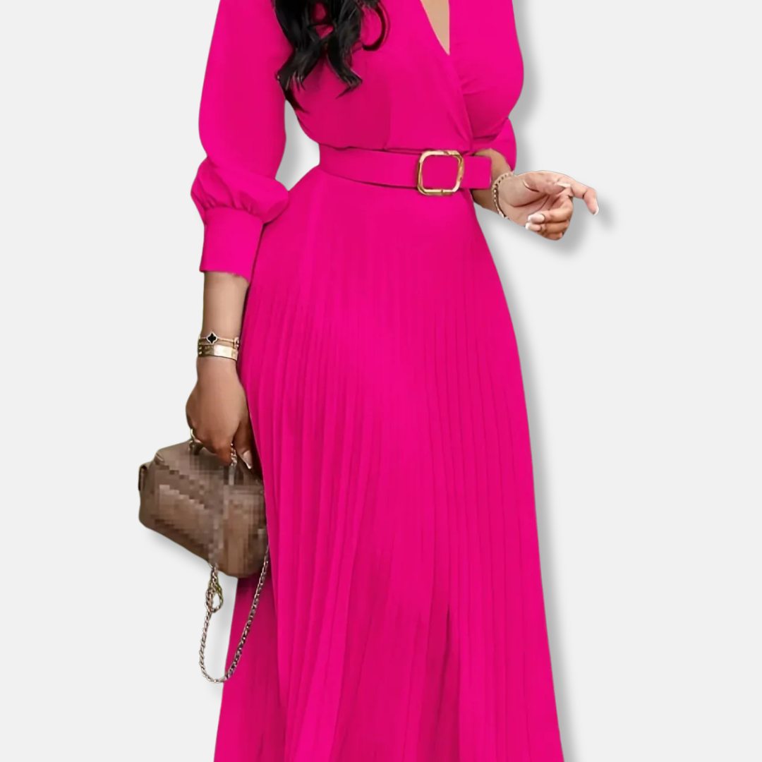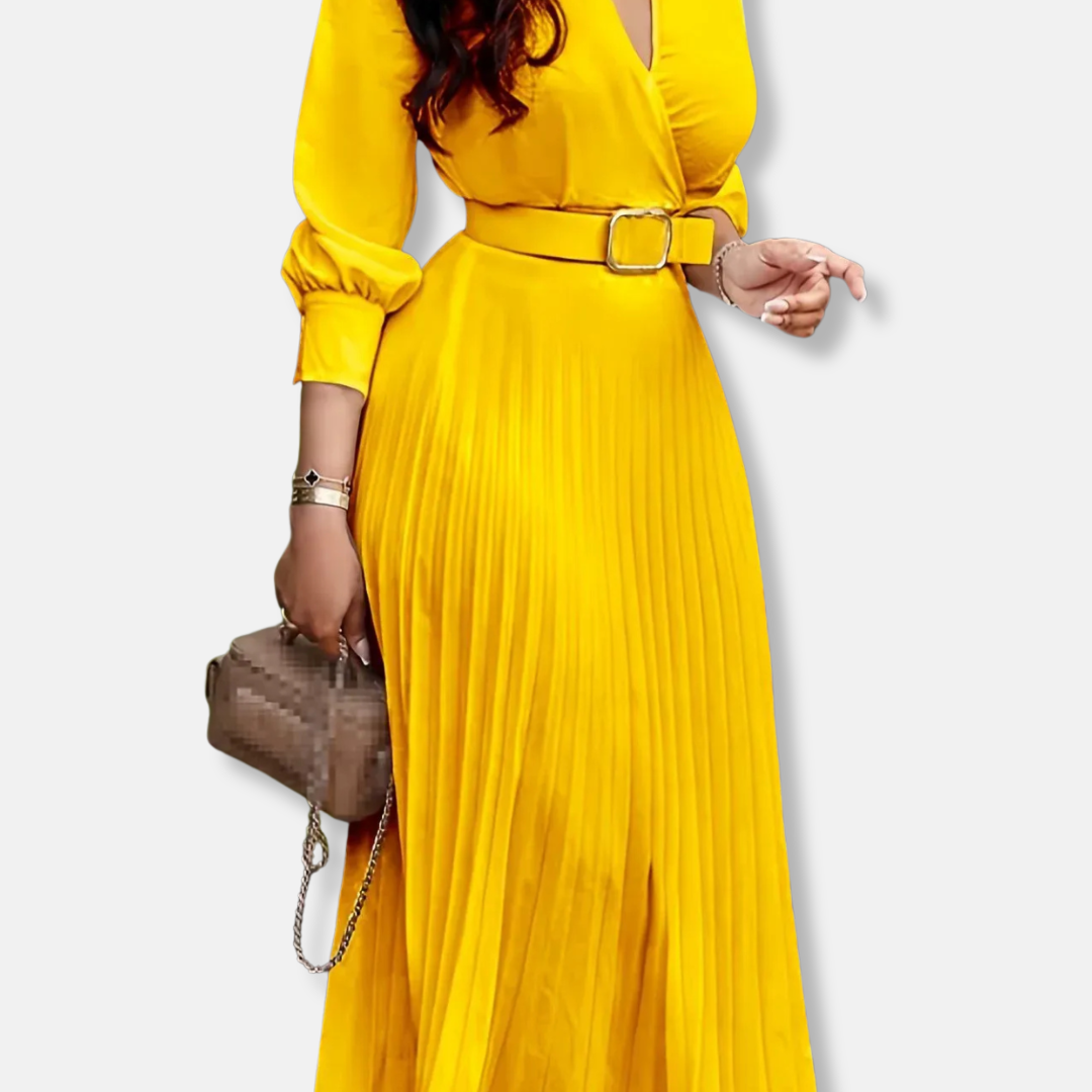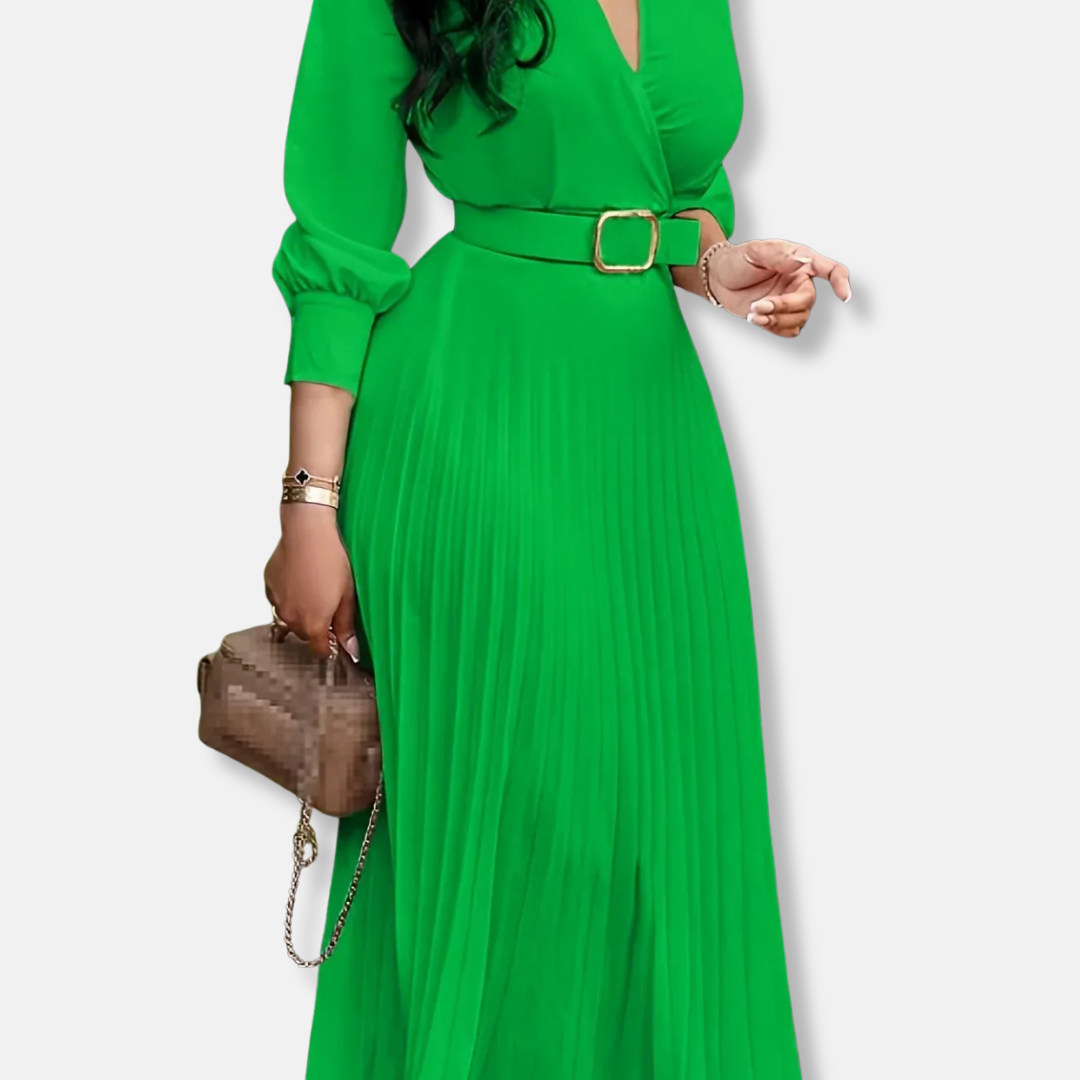 Damklänning Midi – A-linjeformad med Omlottdesign – Puffärm – Plisserad Kjol – Skärp i Midjan