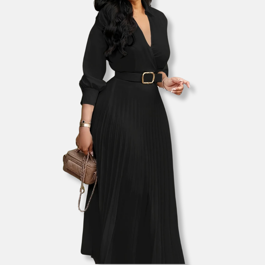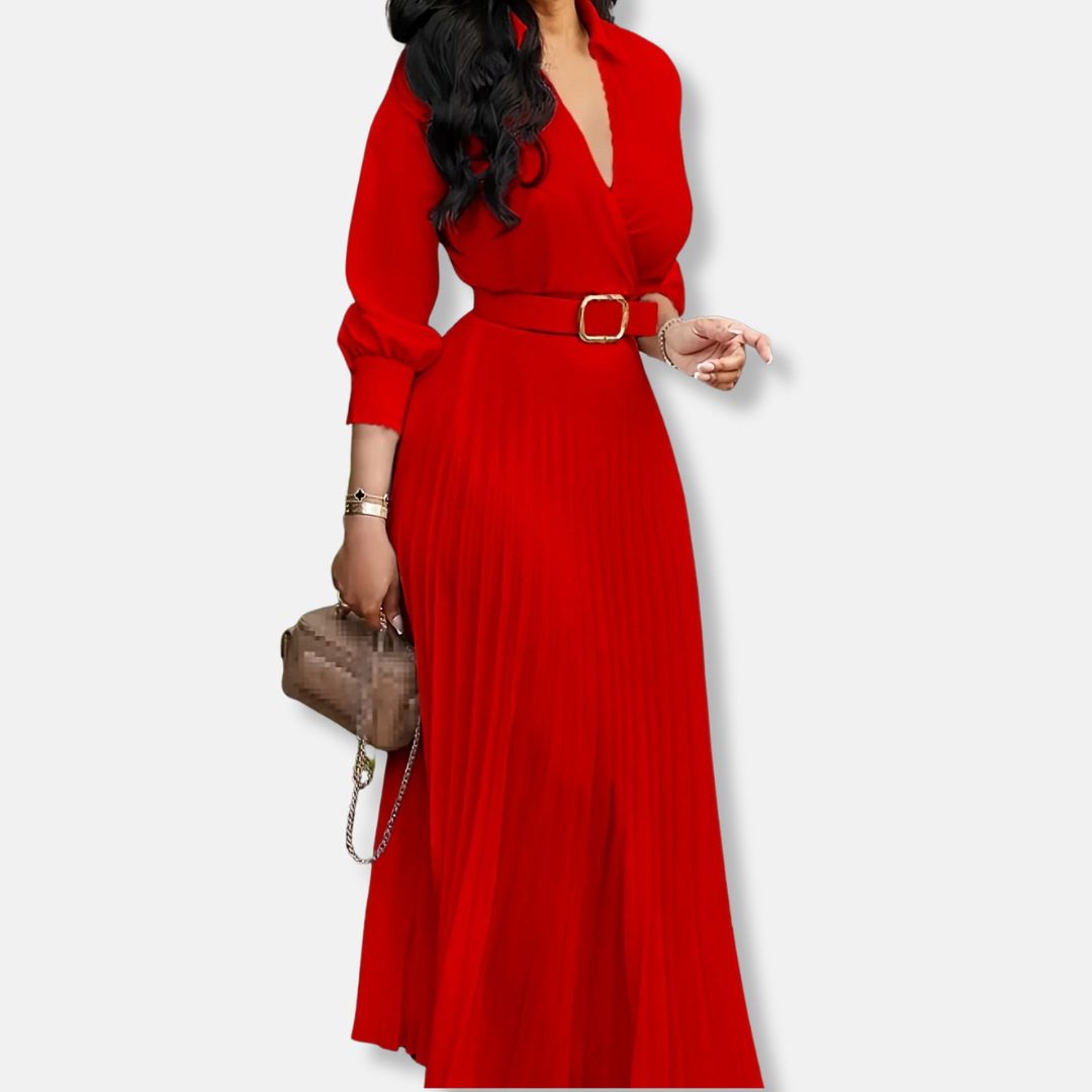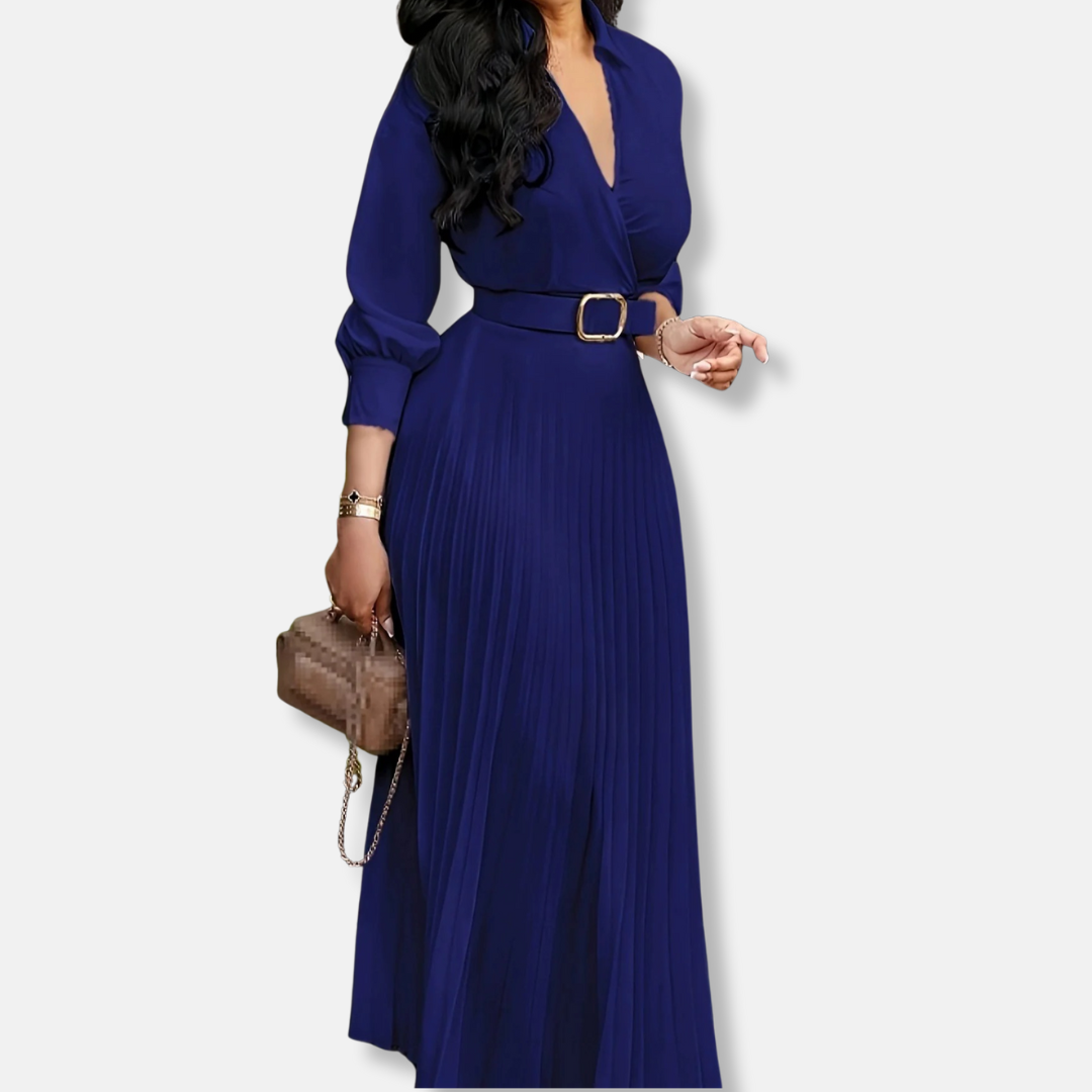 Damklänning Midi – A-linjeformad med Omlottdesign – Puffärm – Plisserad Kjol – Skärp i Midjan