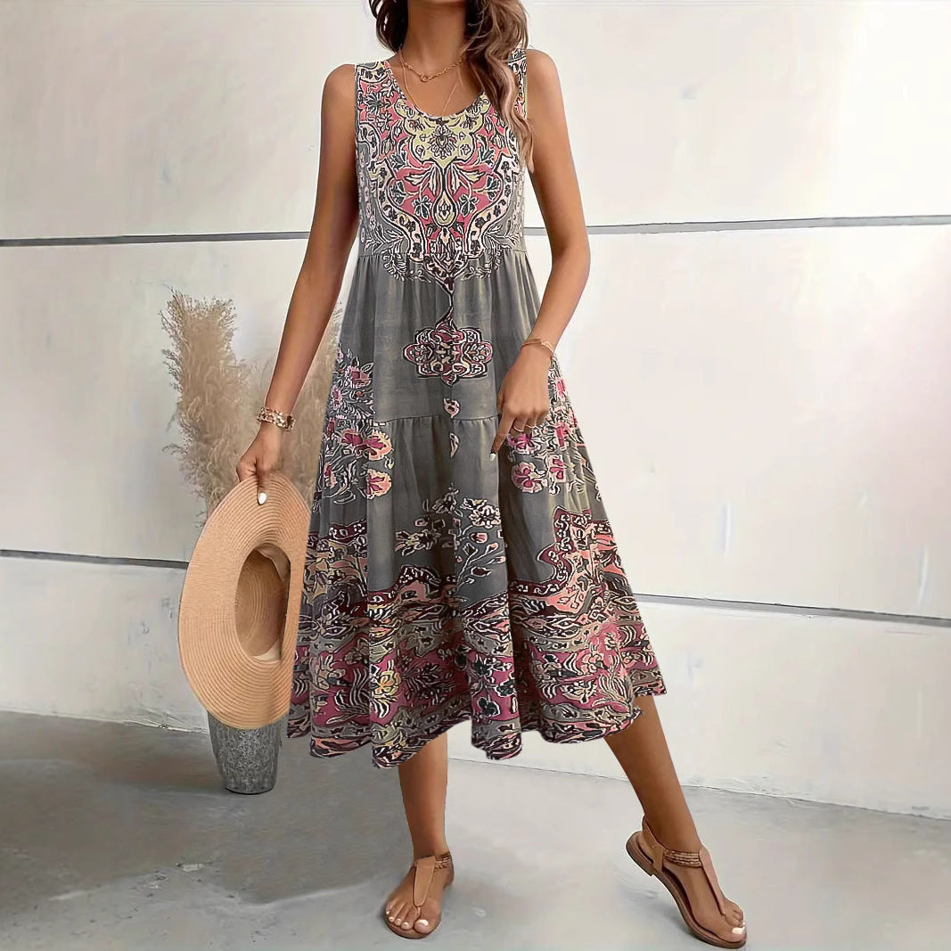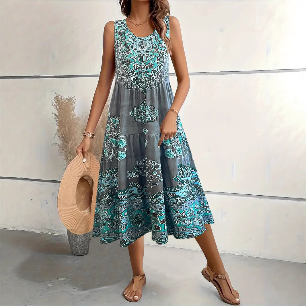 Damklänning midi – A-linjeformad passform – Ärmlös – U-ringning – Blommigt mönster – Bomullsblandning