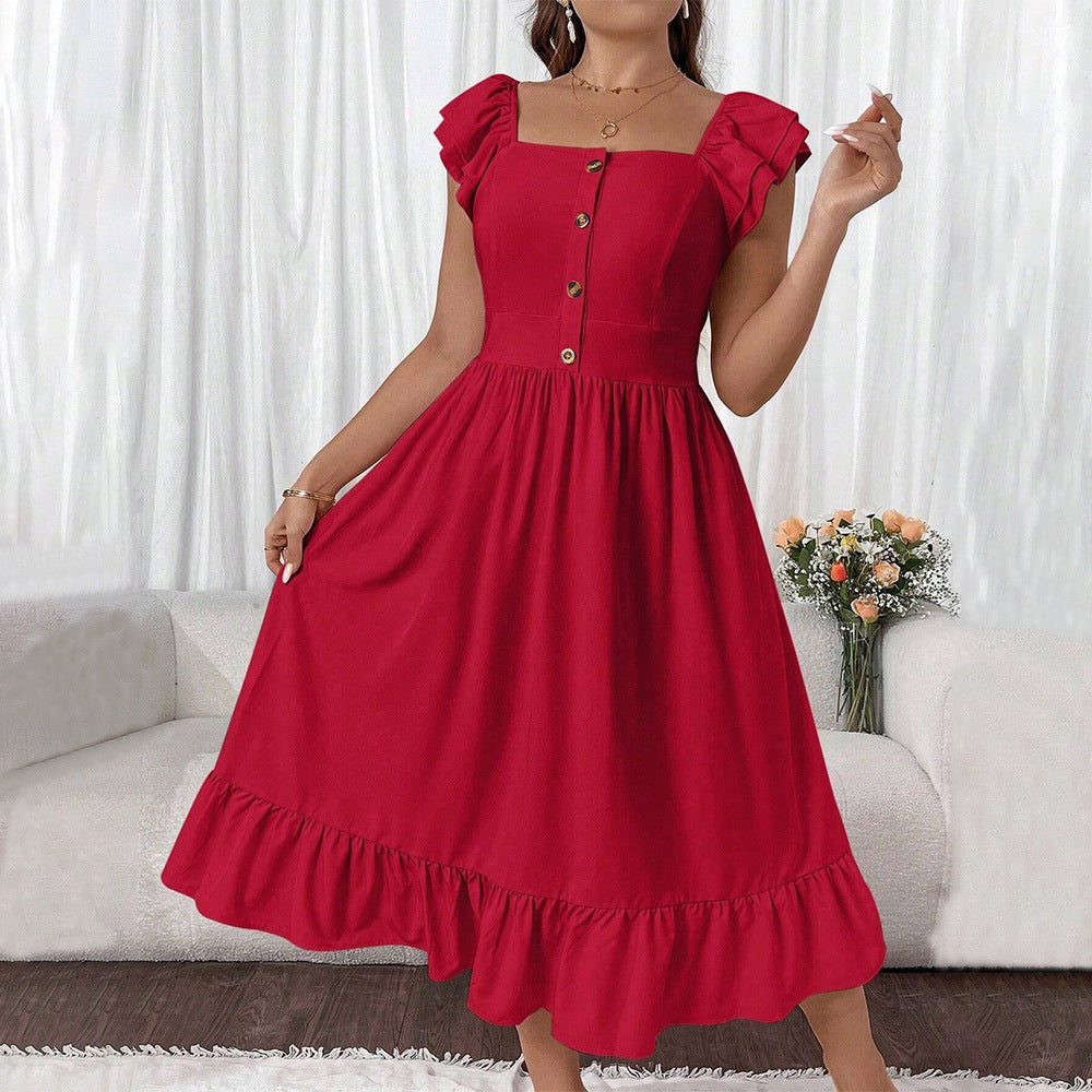 Damklänning midi – A-linjeformad passform – Ryschärmar – Knäppning fram – Fyrkantig urringning