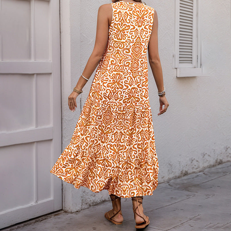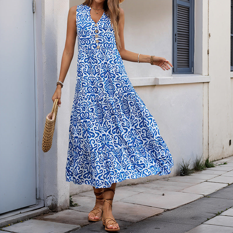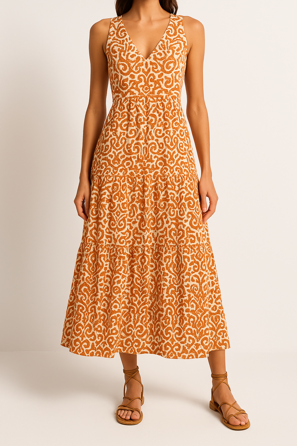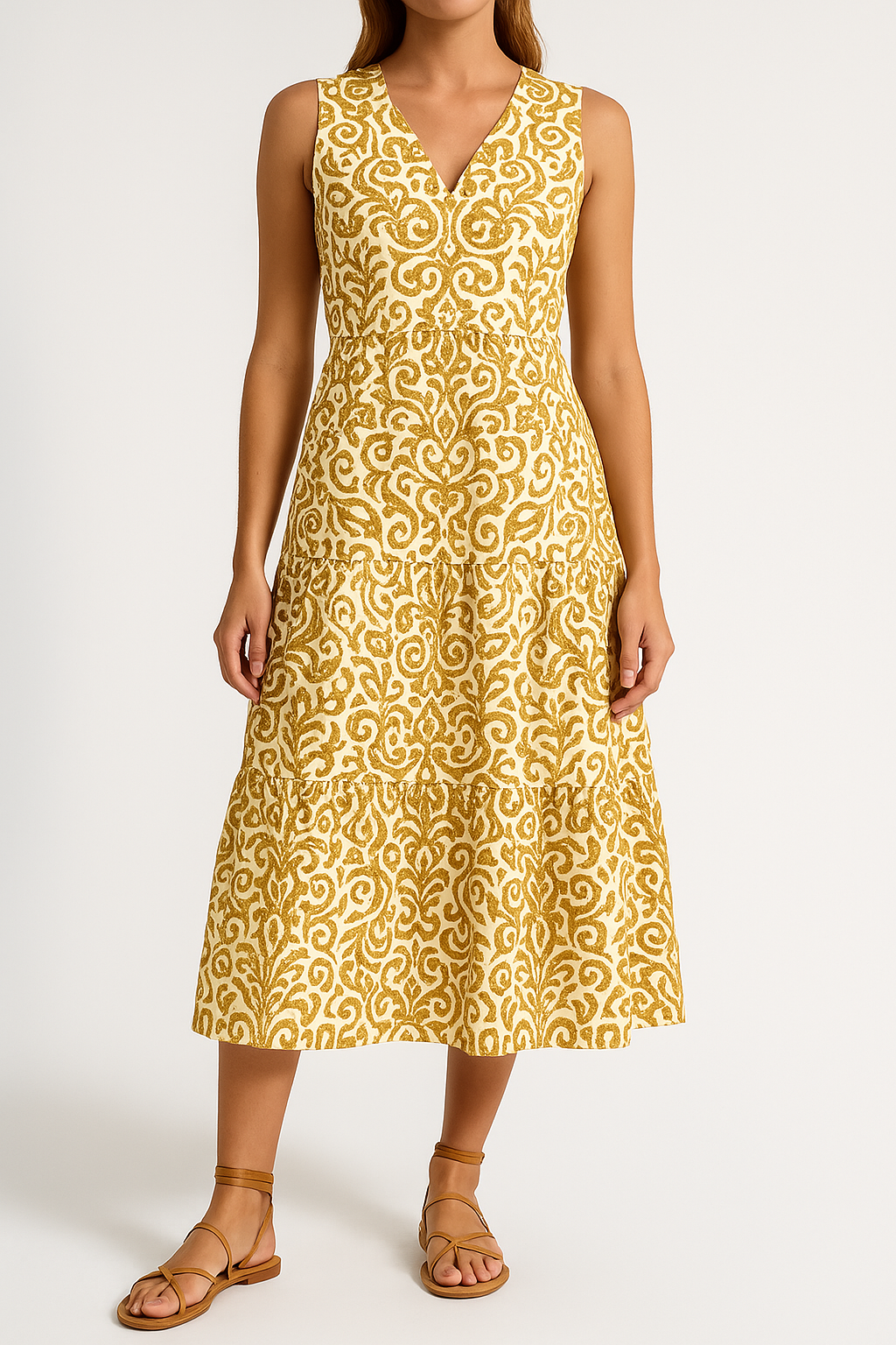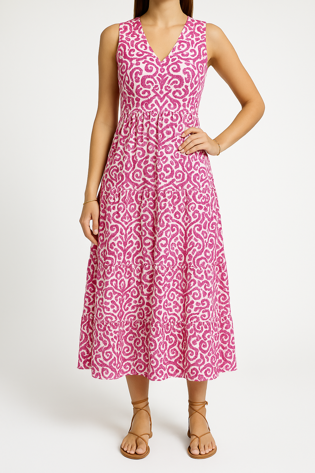 Damklänning midi – ärmlös V-ringning – avslappnad passform – abstrakt mönster – A-linjeformad