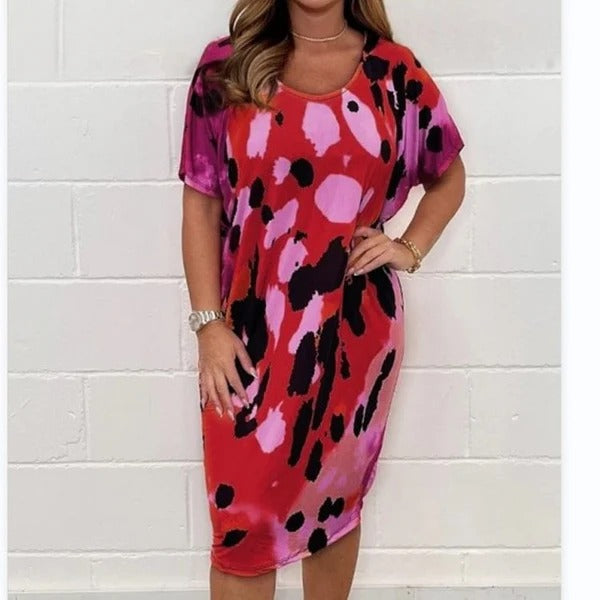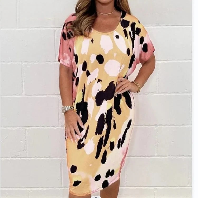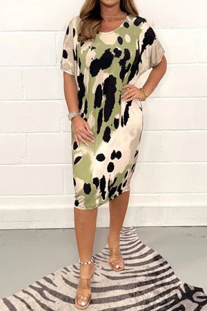 Damklänning midi – Avslappnad passform – Akvarellmönster – Kort ärm