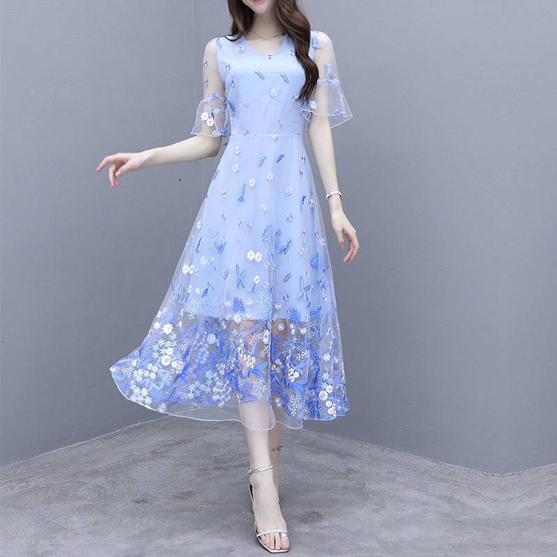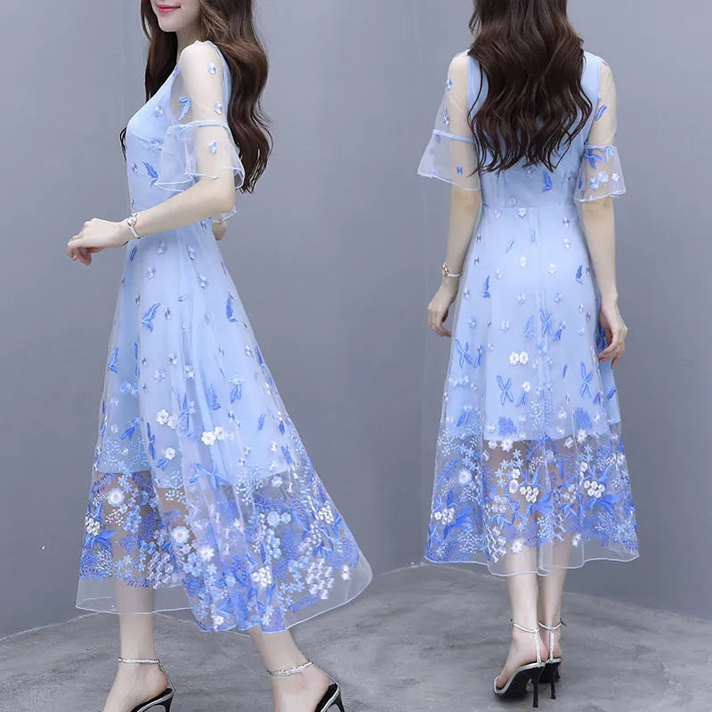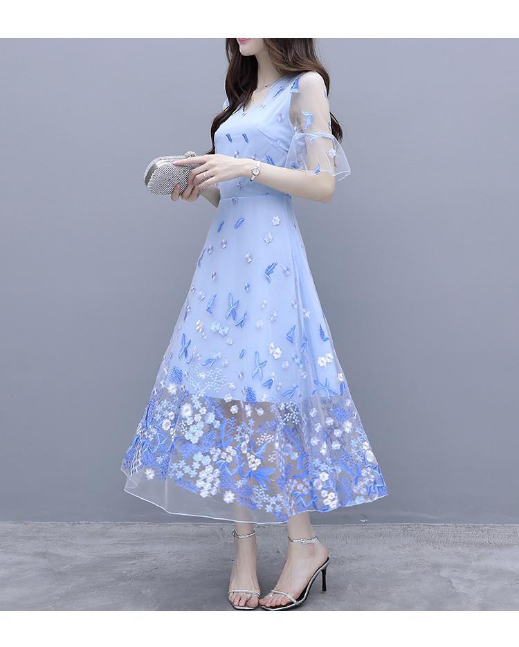 Midiklänning för kvinnor – Blommigt tryck – Volangärmar – Skir blå överdel