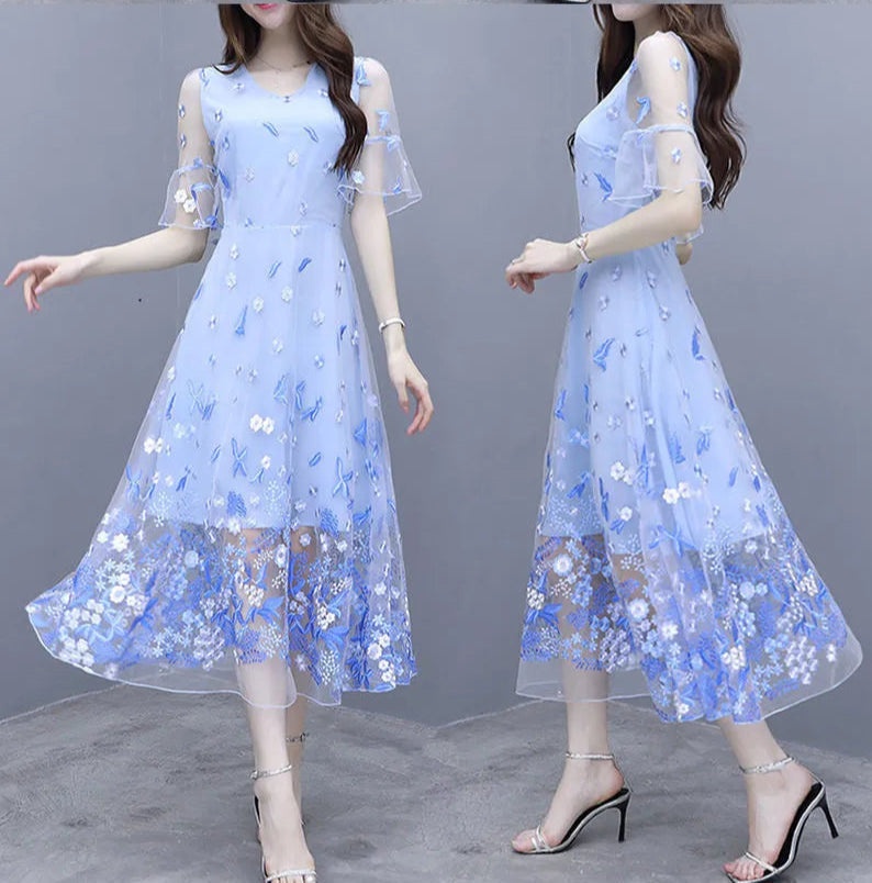 Kliv in i elegansen med denna drömlika blommiga midiklänning, perfekt för brunch eller speciella tillfällen. De mjuka volangärmarna och det skira blåa överlägget ger en romantisk touch till den tidlösa silhuetten. Matcha den med klackar och fina accessoarer för en komplett feminin look.