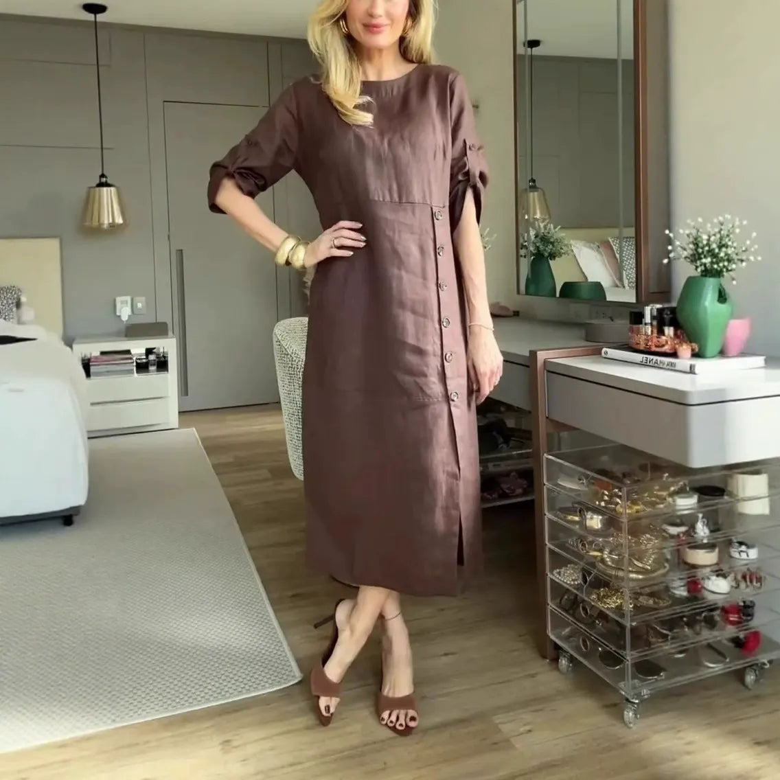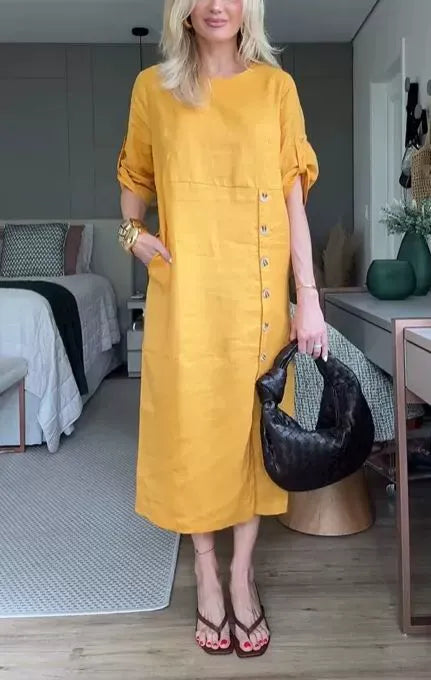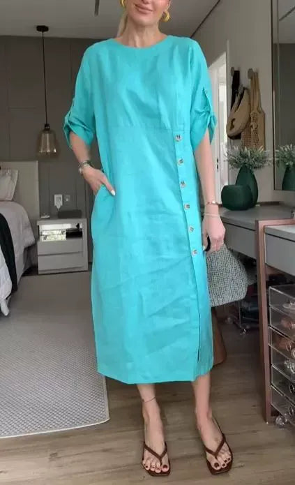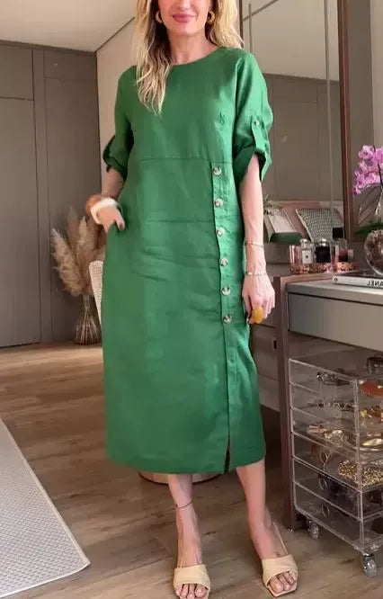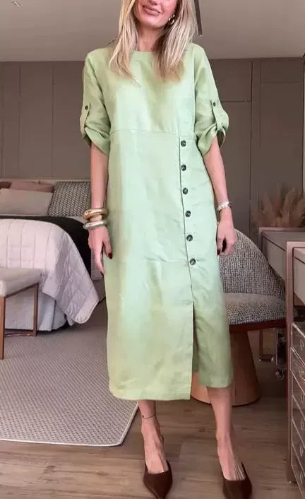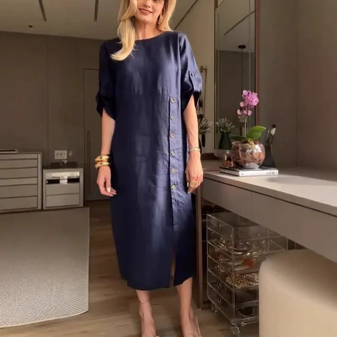 Damklänning midi – Linne bomull – Avslappnad passform – Korta ärmar – Knappdetalj