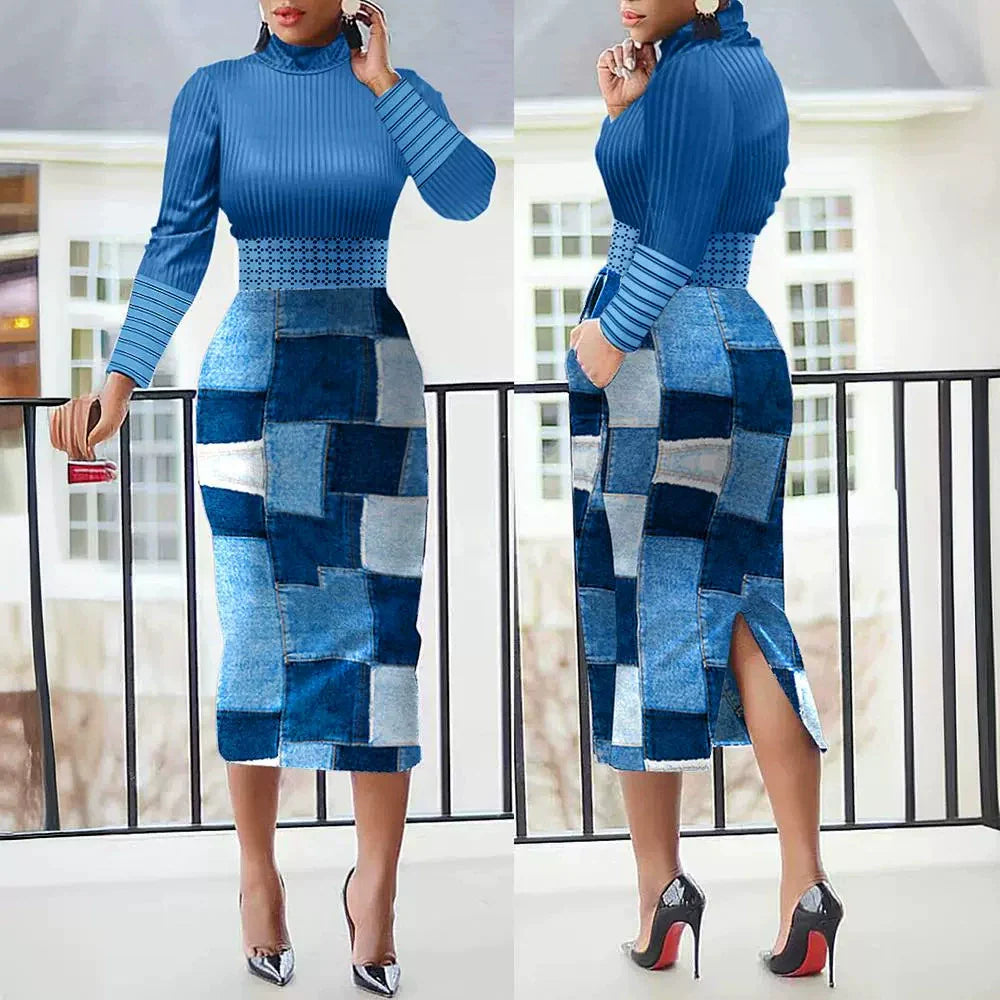 Damklänning Midi – Slim Fit – Prickigt Mönster – Långärmar – Slits Bak