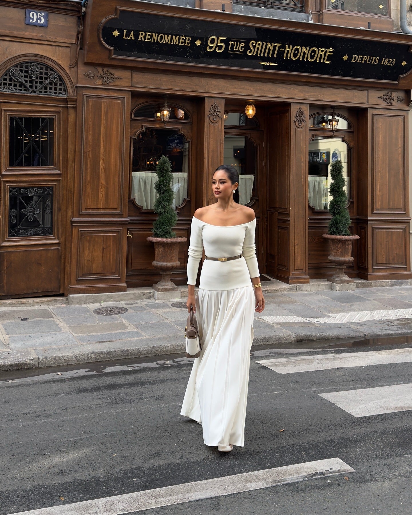 Damklänning off shoulder – figurnära överdel – lång ärm – plisserad maxikjol