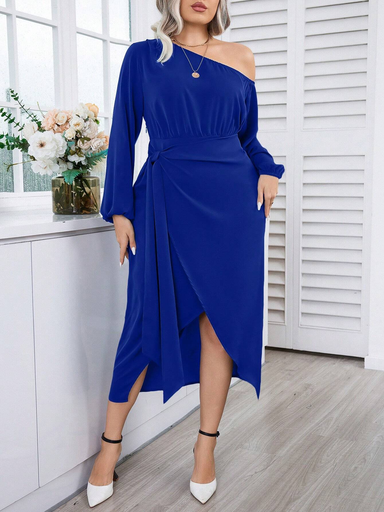 Damklänning – Omlottmodell – Figurnära Passform – Asymmetrisk Halsringning – Lång Ärm – Midilängd