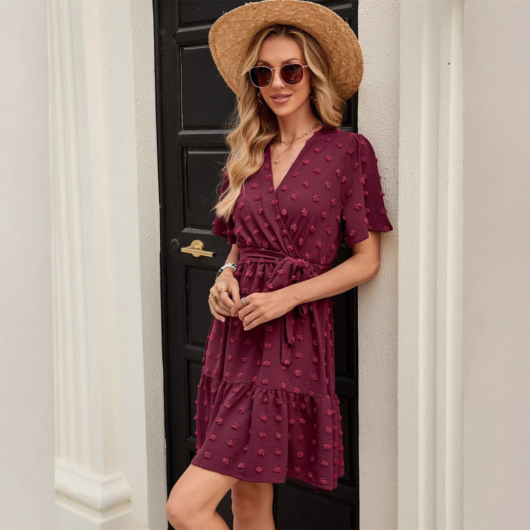 Damklänning – Omlottmodell – V-ringning – Rynkad Volangkant – Kort Ärm – Avslappnad Passform