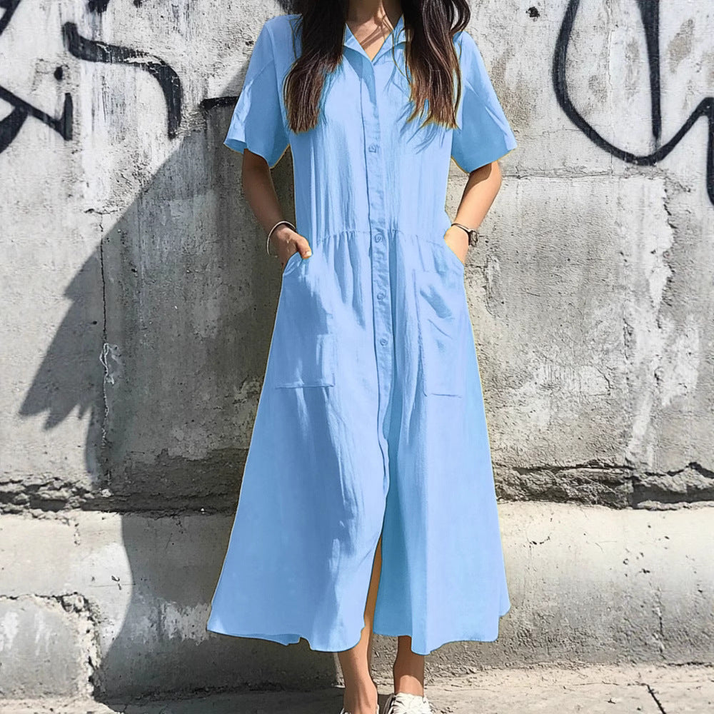 Damklänning skjortmodell – Avslappnad passform – Knäppning framtill – Andningsbar blandning – Midilängd är din perfekta sommarfavorit! Denna bekväma skjortklänning med andningsbar blandning och avslappnad passform är idealisk för vardag och semester. Elegant midilängd med praktisk knäppning framtill. Stilren damklänning för alla tillfällen.