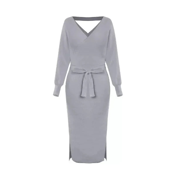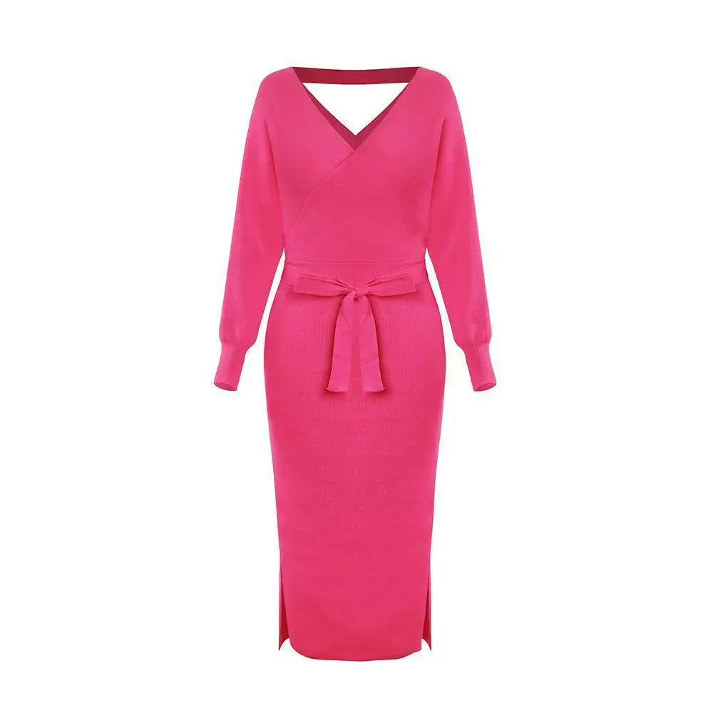 Damklänning stickad – Slim Fit – V-ringning – Midi – Självknuten midja – Lång ärm