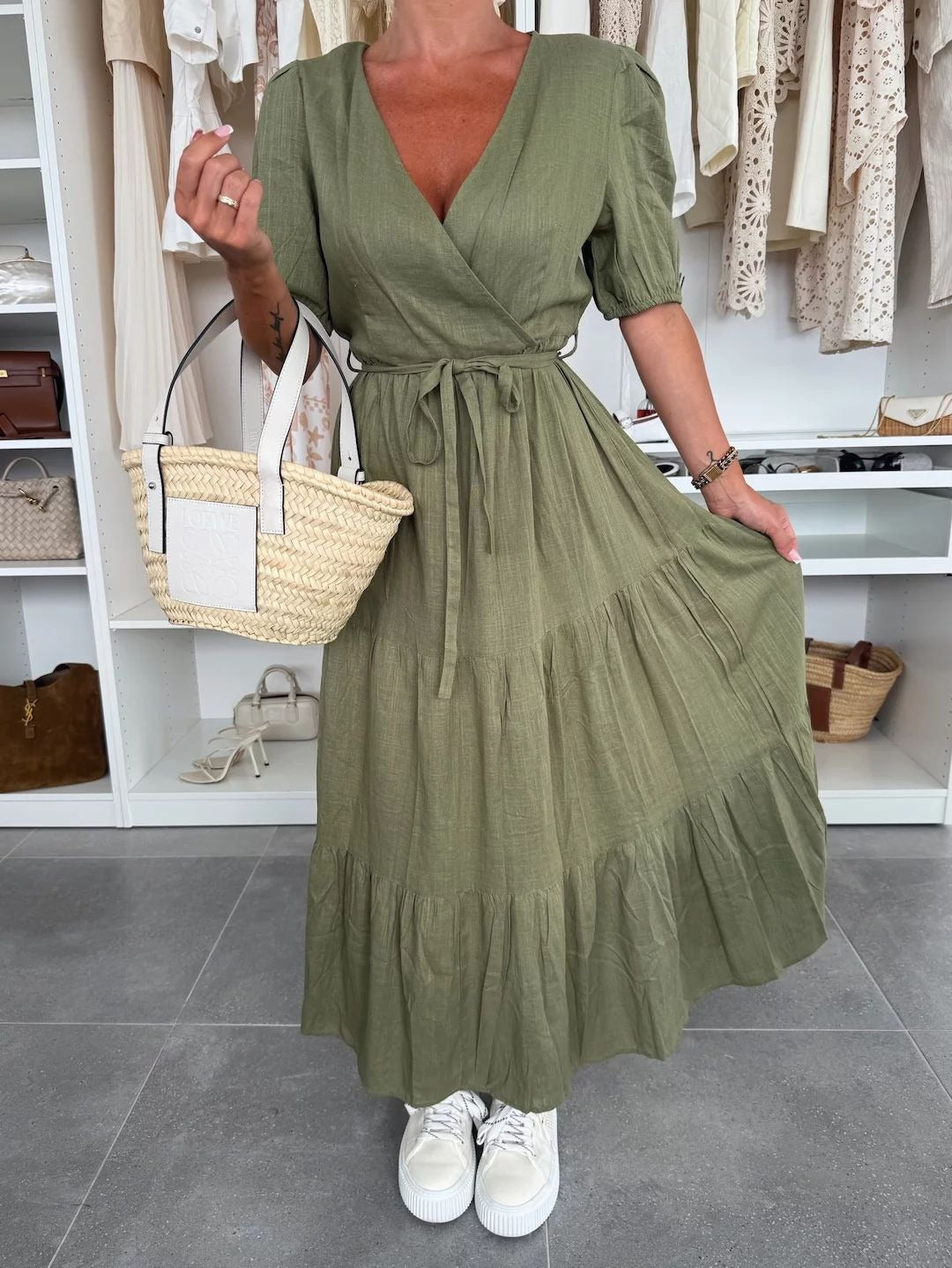 Upptäck Damklänning – V-ringning – Omlottmodell – A-linjeform – Kort puffärm – Maxilängd. Denna eleganta damklänning med smickrande V-ringning och omlottdesign erbjuder en bekväm, luftig A-linjeform i maxilängd, perfekt för sommar och fest. En stilsäker vardagsklänning.