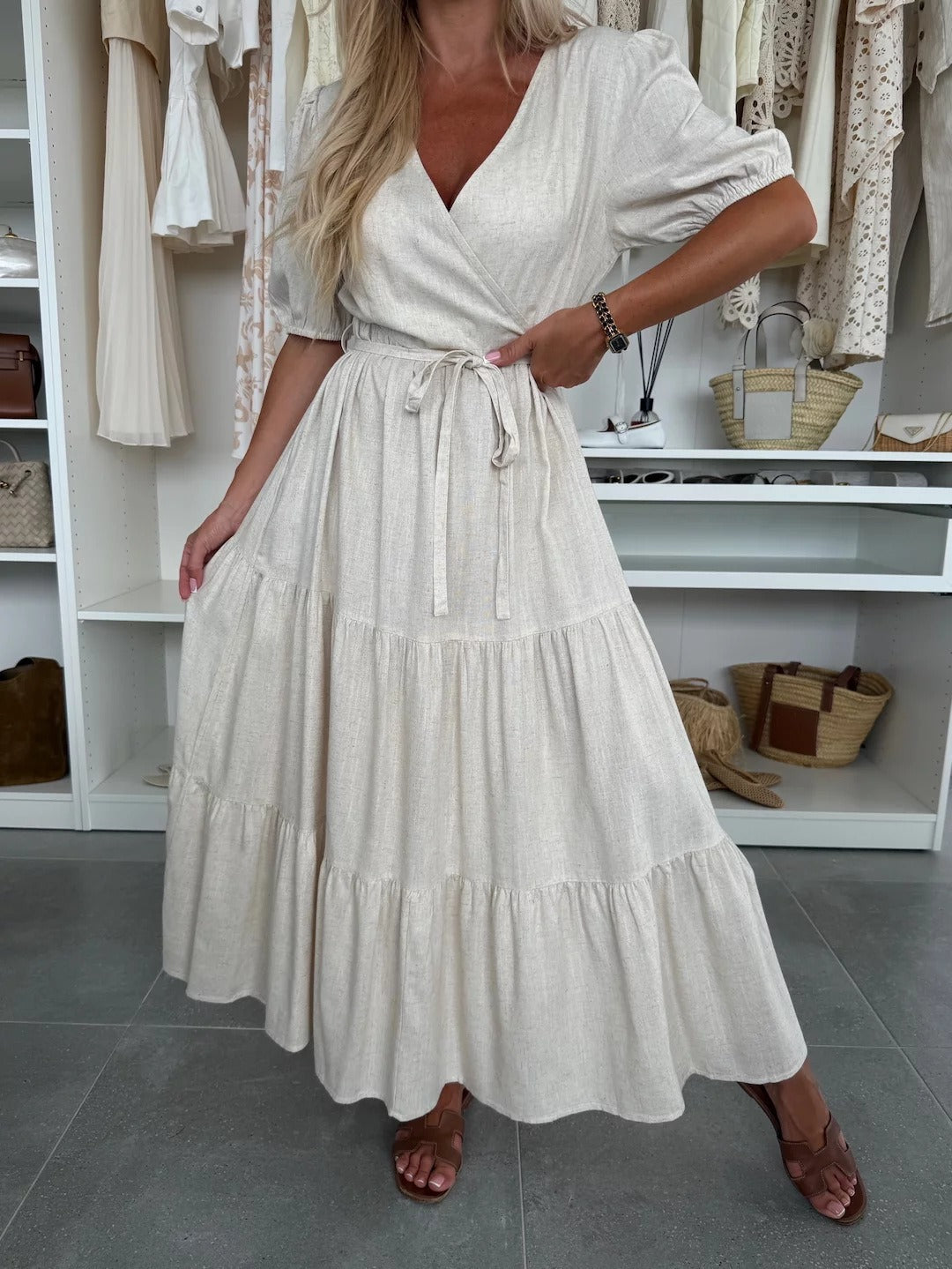- Design: V-ringning, Omlottmodell, A-linjeform, Kort puffärm, Maxilängd